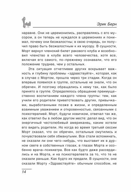 Всемирно известный психолог Эрик Берн — создатель транзакционного анализа и основанной на нем знаменитой системы психологической помощи, позволяющей людям самостоятельно решать проблемы, возникающие во взаимоотношениях с окружающими. Эта книга, успешно выдержавшая множество переизданий и выпущенная многомиллионным тиражом на многих языках, посвящена тому, чтобы научить читателя профессионально анализировать нюансы своего общения, а также помочь избавиться от многих поведенческих стереотипов и комплексов, мешающих в повседневной жизни. Первоначально данная работа задумывалась как продвинутый учебник психоанализа, однако в итоге автор сумел изложить ее простым и доступным каждому языком с использованием ярких и остроумных образов. «Люди, которые играют в игры», ставшая интернациональным бестселлером много лет назад, до сих пор остается одной из популярнейших книг по психологии во всем мире.