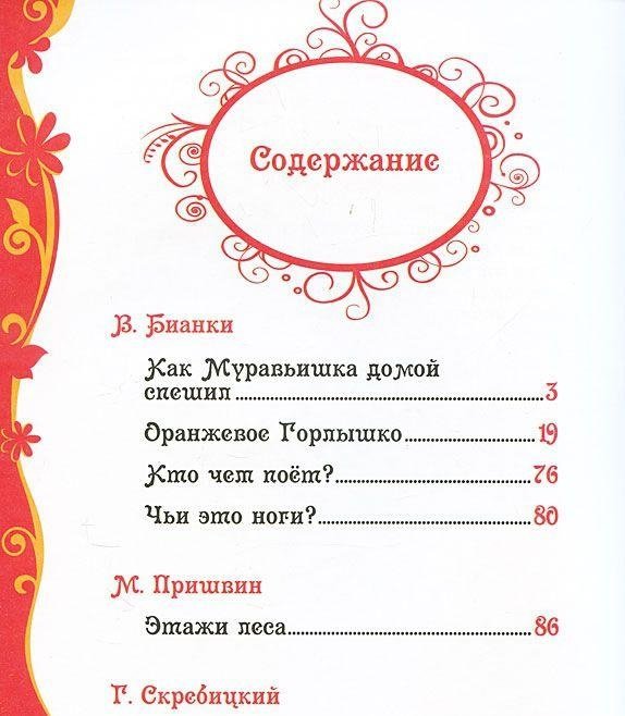 В книгу вошли: "Как Муравьишка домой спешил", "Оранжевое горлышко", "Воришка", "Отчего у лисы длинный хвост? ", "Кот ворюга" и другие произведения о животных. Яркие иллюстрации на каждой странице.