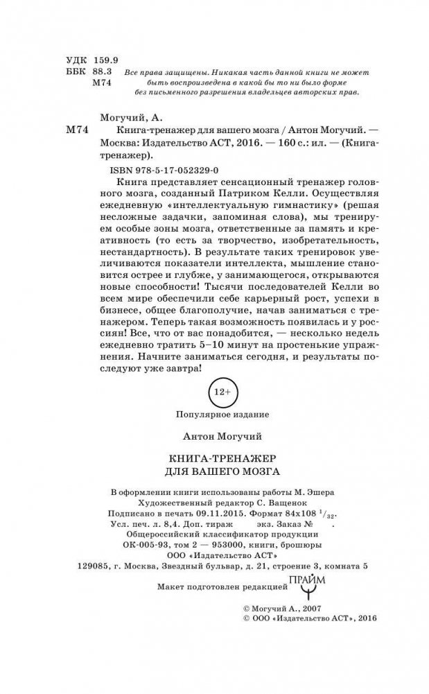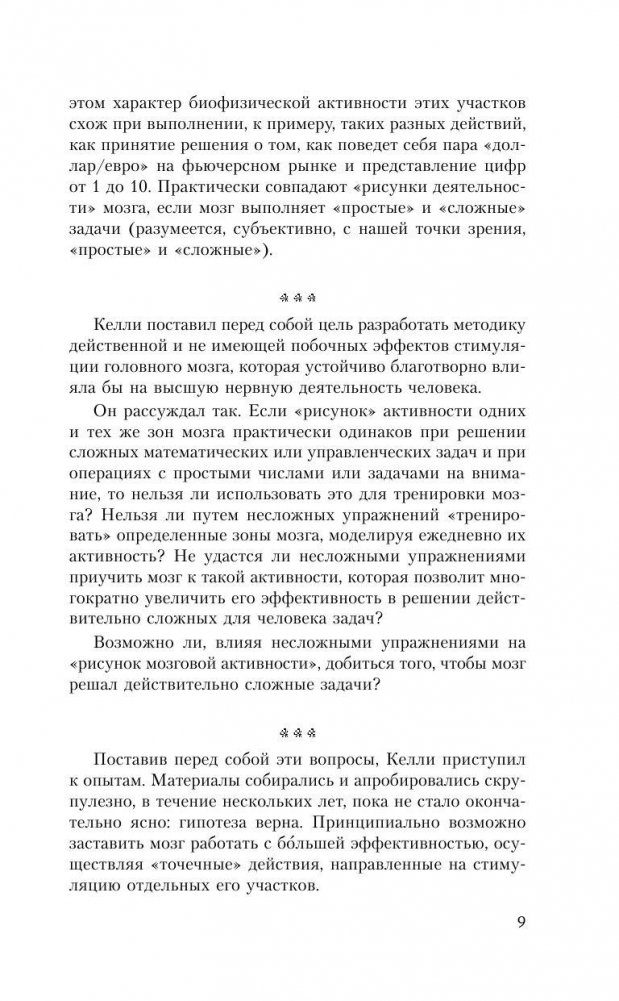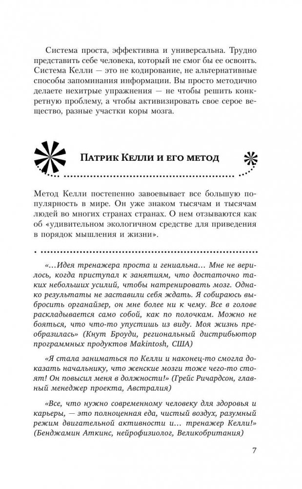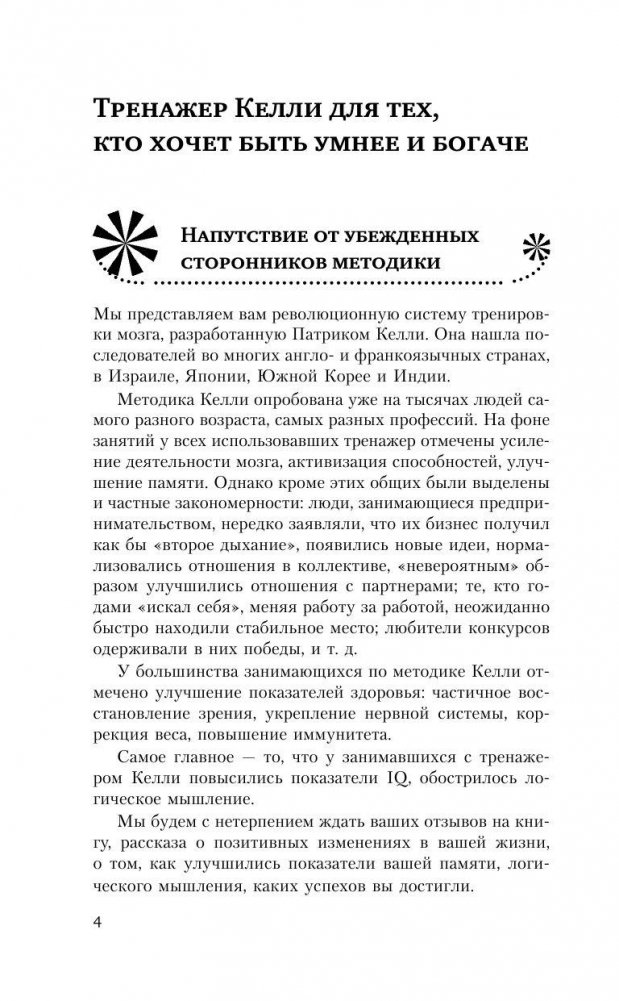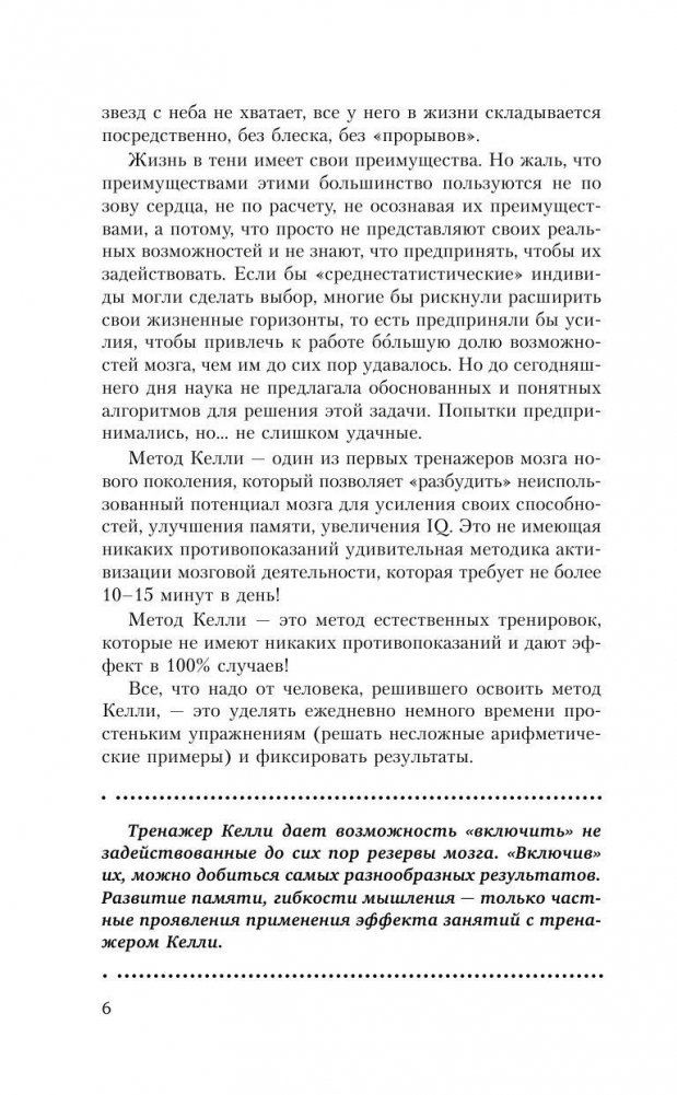 Книга представляет сенсационный тренажер головного мозга, созданный Патриком Келли. Осуществляя ежедневную "интеллектуальную гимнастику" (решая несложные задачки, запоминая слова), мы тренируем особые зоны мозга, ответственные за память и креативность (то есть за творчество, изобретательность, нестандартность). В результате таких тренировок увеличиваются показатели интеллекта, мышление становится острее и глубже, у занимающегося, открываются новые способности! Тысячи последователей Келли во всем мире обеспечили себе карьерный рост, успехи в бизнесе, общее благополучие, начав заниматься с тренажером. Теперь такая возможность появилась и у россиян! Все, что от вас понадобится, - несколько недель ежедневно тратить 5-10 минут на простенькие упражнения. Начните заниматься сегодня, и результаты последуют уже завтра!