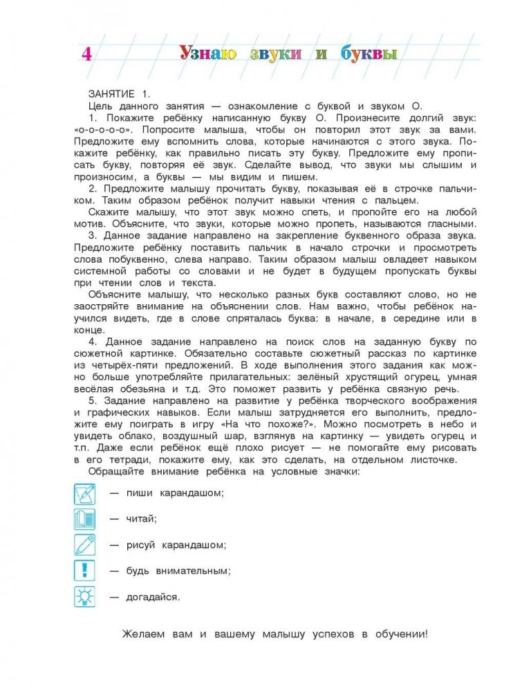 Основная задача данной книги — подготовить ребенка, не знакомого с буквами, к обучению чтению. Система разнообразных заданий направлена на развитие связной речи, мышления, внимания, памяти, творческого воображения. Регулярно занимаясь по пособию, малыш научится читать по слогам двух- трехсложные слова, определять звуки в словах, составлять рассказ по картинке, писать печатные буквы и несложные слова. Предназначено воспитателям дошкольных образовательных учреждений, гувернерам и родителям для занятий с детьми как в детском саду, так и в домашних условиях.
