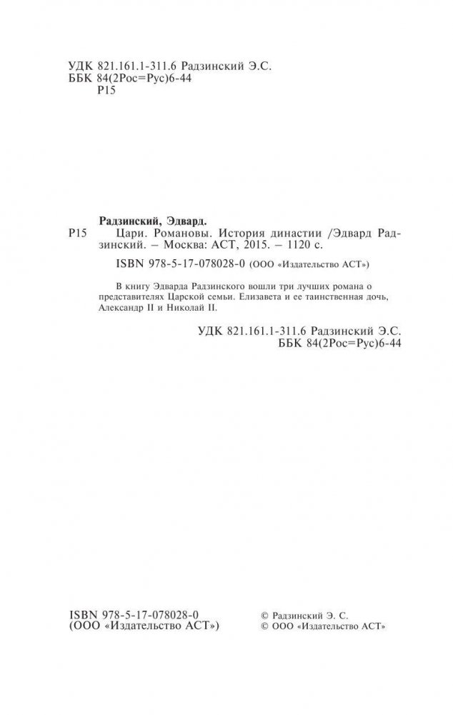 В книгу Эдварда Радзинского вошли три лучших романа о представителях Царской семьи. Елизавета и ее таинственная дочь, Александр I и Николай II.