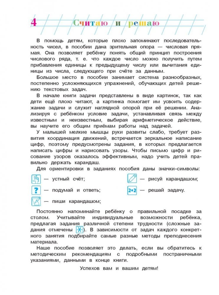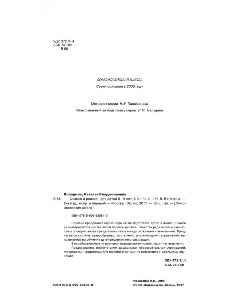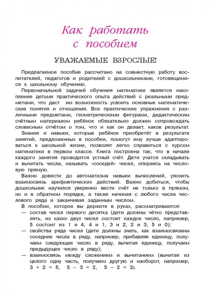 Пособие продолжает серию изданий по подготовке детей к школе. В книге рассматриваются состав чисел первого десятка, свойства ряда чисел и взаимосвязь соседних чисел в ряду, взаимосвязь между сложением и вычитанием. Предлагается система разнообразных, постепенно усложняющихся упражнений, направленных на обучение детей решению текстовых задач. В пособие включены упражнения на развитие внимания, памяти и мышления. Предназначено воспитателям дошкольных образовательных учреждений, гувернерам и родителям для занятий с детьми по подготовке к школьному обучению.