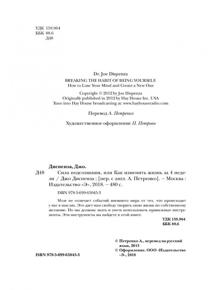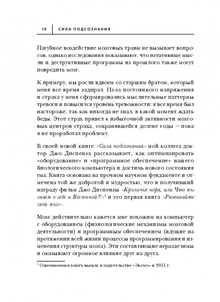 Мозг не отличает событий внешнего мира от тех, что происходят у нас в мыслях. Это дает нам свободу творить свою жизнь по собственному желанию. Но мы должны знать и уметь использовать правильные инструменты. Эти инструменты вы найдете в новой книге Джо Диспензы, автора мировых бестселлеров по развитию мозга и способностей, доктора хиропрактики и нейрофизиологии, научного консультанта журнала «Explore!» и участника проекта «Кроличья нора».