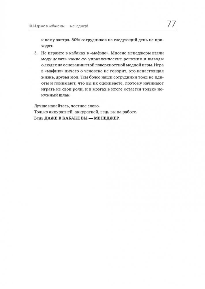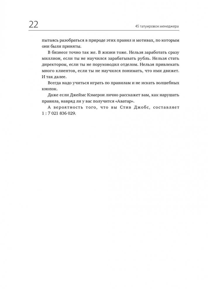 Татуировка — это надпись на всю жизнь. Важная надпись. Названия глав в этой книге — татуировки, оставшиеся в памяти и сердце менеджера, его житейский и организаторский опыт. Это правила о том, как относиться к коллегам, каким образом действовать в определенных ситуациях: свод принципов, которым стоит следовать, если хочешь добиться успеха. Почему? Потому что за каждой главой стоят осмысленные действия, чья-то боль, мучения, радости, удачный и неудачный опыт, подъемы и падения, увольнения и лидерство, а главное — нужный результат.