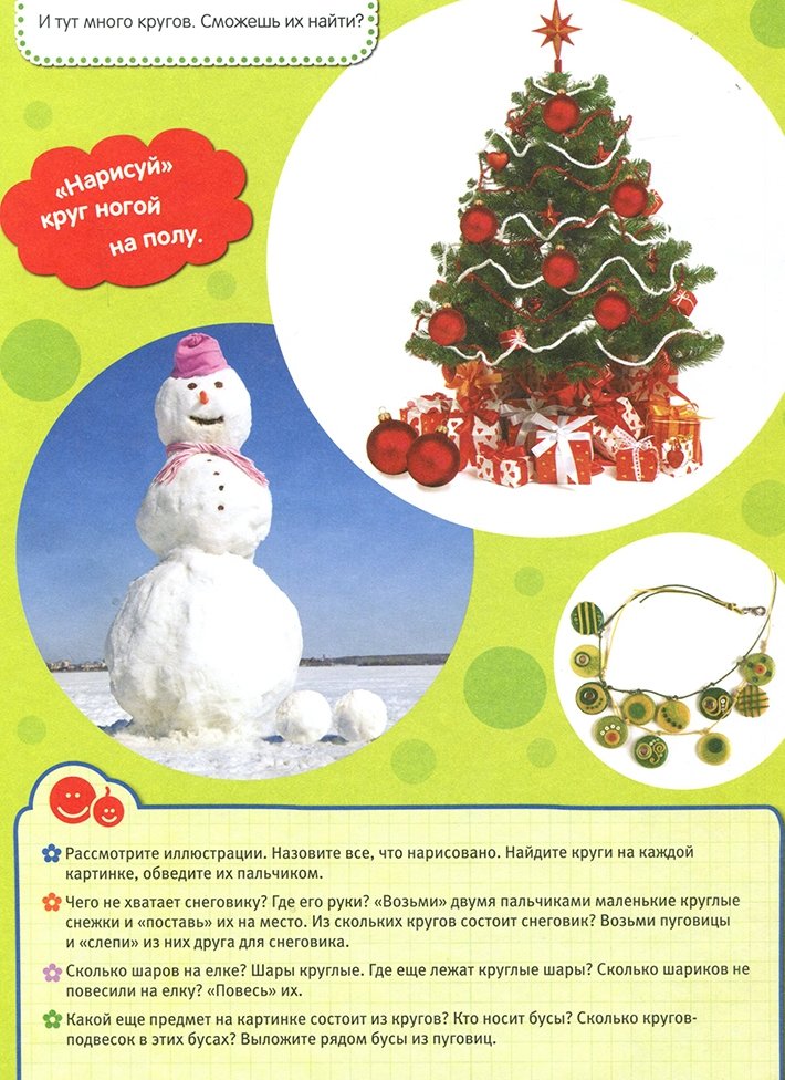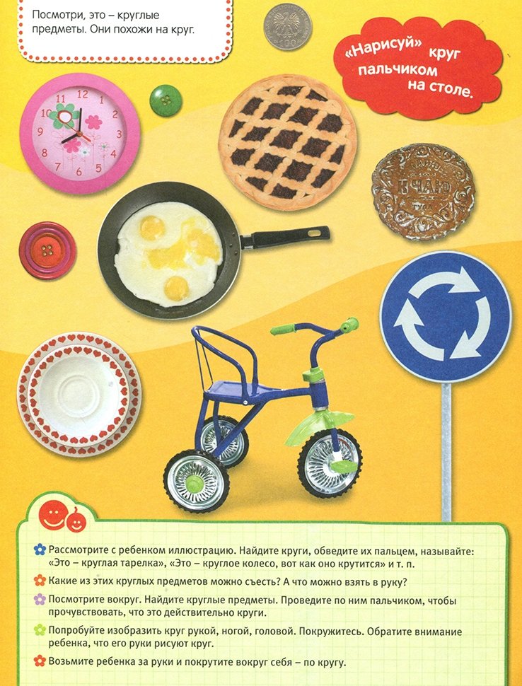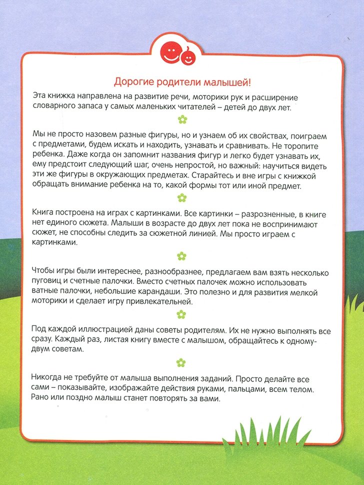 Эта книжка направлена на развитие речи, моторики рук и расширение словарного запаса у самых маленьких читателей - детей до двух лет. Мы не просто назовем разные фигуры, но и узнаем об их свойствах, поиграем с предметами, будем искать и находить, узнавать и сравнивать. Не торопите ребенка. Даже когда он запомнит названия фигур и легко будет узнавать их, ему предстоит следующий шаг, очень непростой, но важный: научиться видеть эти же фигуры в окружающих предметах. Старайтесь и вне игры с книжкой обращать внимание ребенка на то, какой формы тот или иной предмет. Книга построена на играх с картинками. Все картинки - разрозненные, в книге нет единого сюжета. Малыши в возрасте до двух лет пока не воспринимают сюжет, не способны следить за сюжетной линией. Мы просто играем с картинками. Чтобы игры были интереснее, разнообразнее, предлагаем вам взять несколько пуговиц и счетные палочки. Вместо счетных палочек можно использовать ватные палочки, небольшие карандаши. Это полезно и для развития мелкой моторики и сделает игру привлекательней. Под каждой иллюстрацией даны советы родителям. Их не нужно выполнять все сразу. Каждый раз, листая книгу вместе с малышом, обращайтесь к одному-двум советам. Никогда не требуйте от малыша выполнения заданий. Просто делайте все сами - показывайте, изображайте действия руками, пальцами, всем телом. Рано или поздно малыш станет повторять за вами.