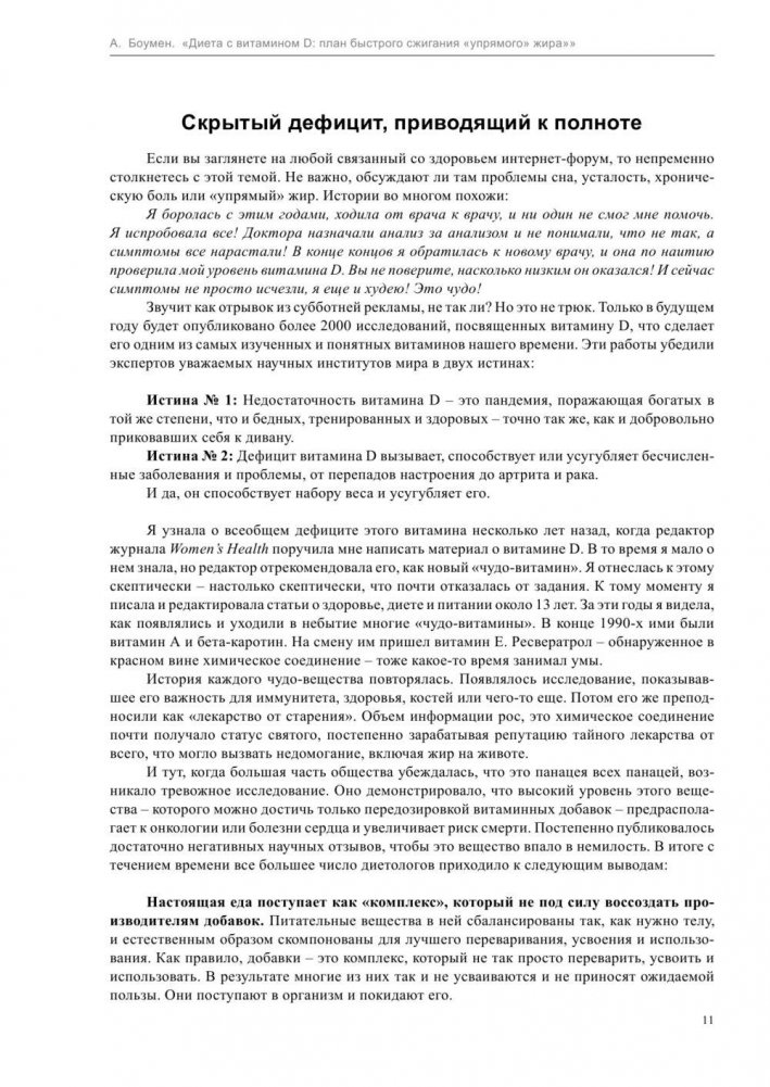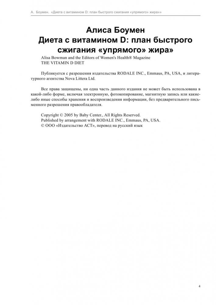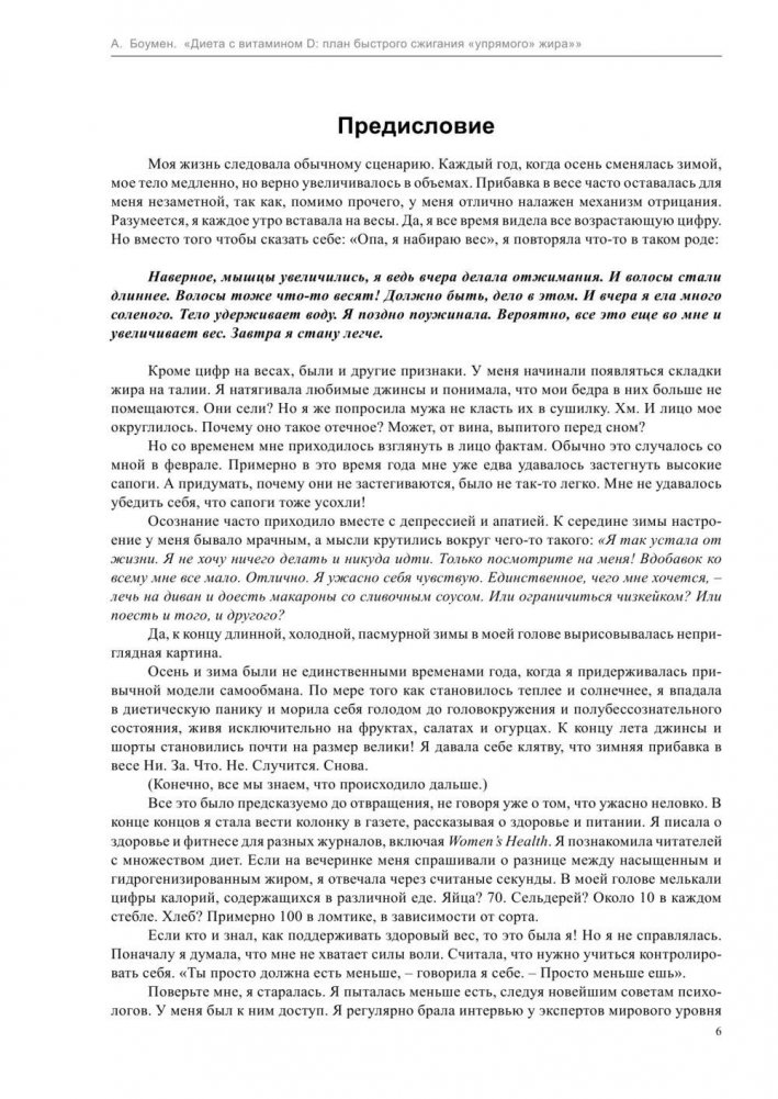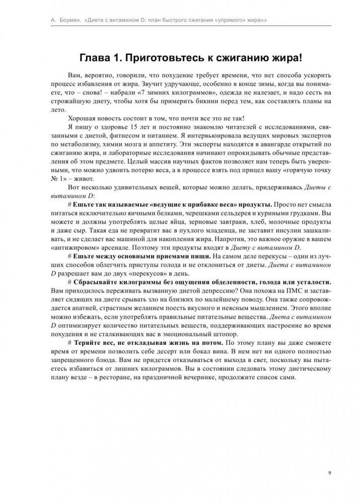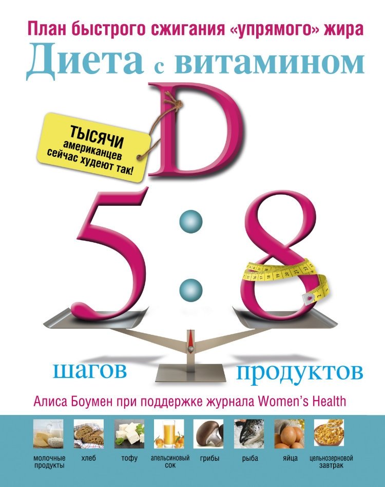 Диета Алисы Боумен состоит из вкусных блюд, обогащенных витамином D и создающих стойкое ощущение сытости. Она поможет вам быстро сжечь жир: вы потеряете 3 килограмма по 7-дневной скоростной программе, а затем перейдете к 4-недельной программе сжигания жира, чтобы навсегда остаться стройной и энергичной. Меню разработано специально для того, чтобы перенасытить ваш организм витамином D, который создает ощущение сытости и уменьшает остроту приступов голода. В нем есть даже уникальный летний и зимний планы, основанные на сезонных продуктах, поднимающие настроение и препятствующие вызываемой диетой депрессии. А поскольку вы можете позволить себе и «перекусы», и десерт, и даже бокал вина, такому плану можно следовать всю жизнь!