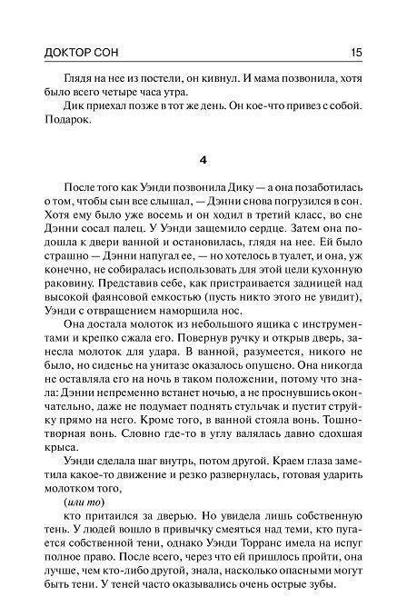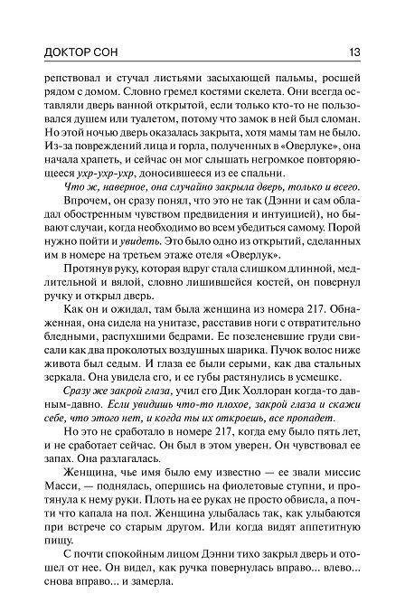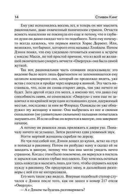 Легендарный роман Стивена Кинга «Сияние», вышедший в 1977 году, перевели на все языки мира и неоднократно экранизировали (наиболее известен вошедший в золотой фонд мирового кинематографа фильм Стэнли Кубрика с блистательным Джеком Николсоном в главной роли). И вот теперь Стивен Кинг вновь возвращается к своим героям, представляя бесчисленным поклонникам продолжение «Сияния» - поразительный роман «Доктор Сон». Дэнни Торранс, сын писателя, уничтоженного темными силами отеля «Оверлук», до сих пор тяготится своим необычайным даром. Ведь способность «сиять» вновь и вновь напоминает ему о трагических событиях, пережитых в детстве и едва не сломавших ему жизнь. На плаву Дэнни поддерживает лишь работа в хосписе, где его способности помогают облегчить пациентам мучительную боль. Но однажды к Дэну приходит двенадцатилетняя девочка Абра, которая излучает «сияние» невероятной, немыслимой силы. И девочке этой угрожает смертельная опасность – на нее объявлена настоящая охота. Дэн Торранс - единственный, кто может ее спасти…