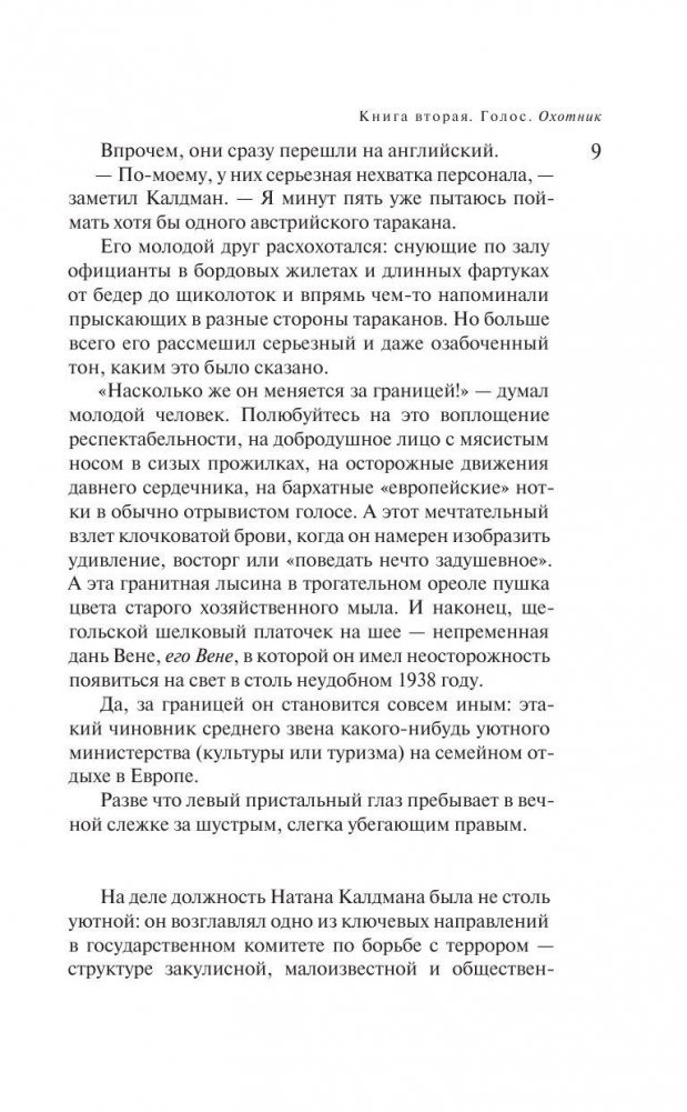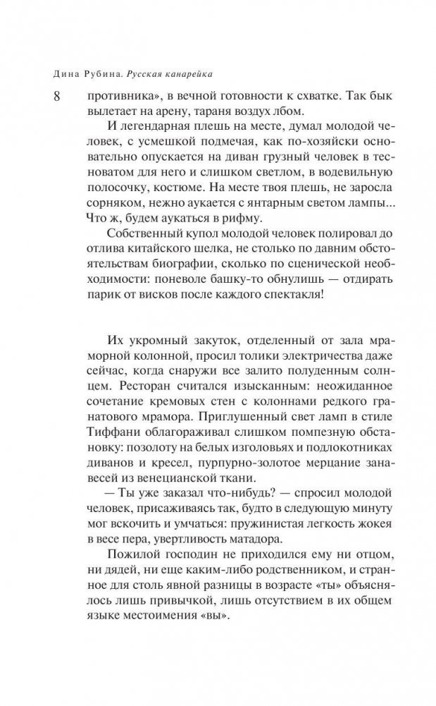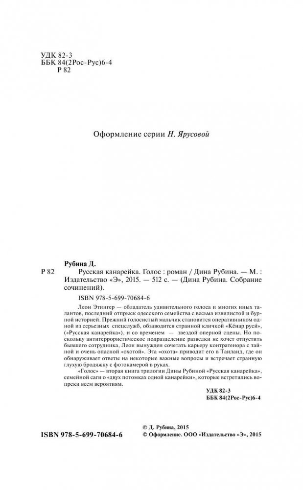 Леон Этингер — обладатель удивительного голоса и многих иных талантов, последний отпрыск одесского семейства с весьма извилистой и бурной историей. Прежний голосистый мальчик становится оперативником одной из серьезных спецслужб, обзаводится странной кличкой «Ке́нар руси́», («Русская канарейка»), и со временем - звездой оперной сцены. Но поскольку антитеррористическое подразделение разведки не хочет отпустить бывшего сотрудника, Леон вынужден сочетать карьеру контратенора с тайной и очень опасной «охотой». Эта охота приводит его в Таиланд, где он обнаруживает ответы на некоторые важные вопросы и встречает странную глухую бродяжку с фотокамерой в руках. «Голос» — вторая книга трилогии Дины Рубиной «Русская канарейка», семейной саги о «двух потомках одной канарейки», которые встретились вопреки всем вероятиям.