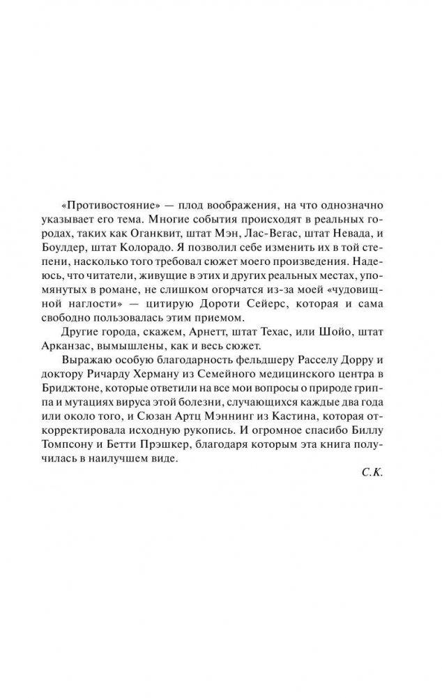 Стивен Кинг - "Противостояние" Стивен Кинг… "Король ужасов"? Да. Непревзойденный мастер проникновения в самые тайные, самые страшные, самые мрачные уголки человеческой души? Да! Жестокий, яростный и агрессивный эстет тьмы, чьи книги пугают и восхищают, возмущают - и все-таки привлекают? О да! ...Каждый из нас - лишь человек, стоящий над черной, адовой бездной собственных страхов. И только Стивен Кинг - великий Стивен Кинг! - может заставить нас шагнуть в эту бездну… Америка превратилась в ад. Из секретной лаборатории вырвался на свободу опаснейший вирус. Умерли сотни тысяч, миллионы ни в чем не повинных людей… Однако и это еще не все. Вступили в игру беспощадные и могучие силы. Рвется к власти таинственный темный человек, способный подчинять себе слабые, сомневающиеся души. Кто он? Откуда явился? Что сулит человечеству его победа? Немногие люди, не утратившие еще представления о Добре и Зле, должны понять это, - ведь, не зная врага, его невозможно победить… Роман "Противостояние" - одно из лучших произведений "короля ужасов" Стивена Кинга - в новом переводе и впервые без сокращений!