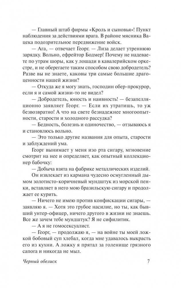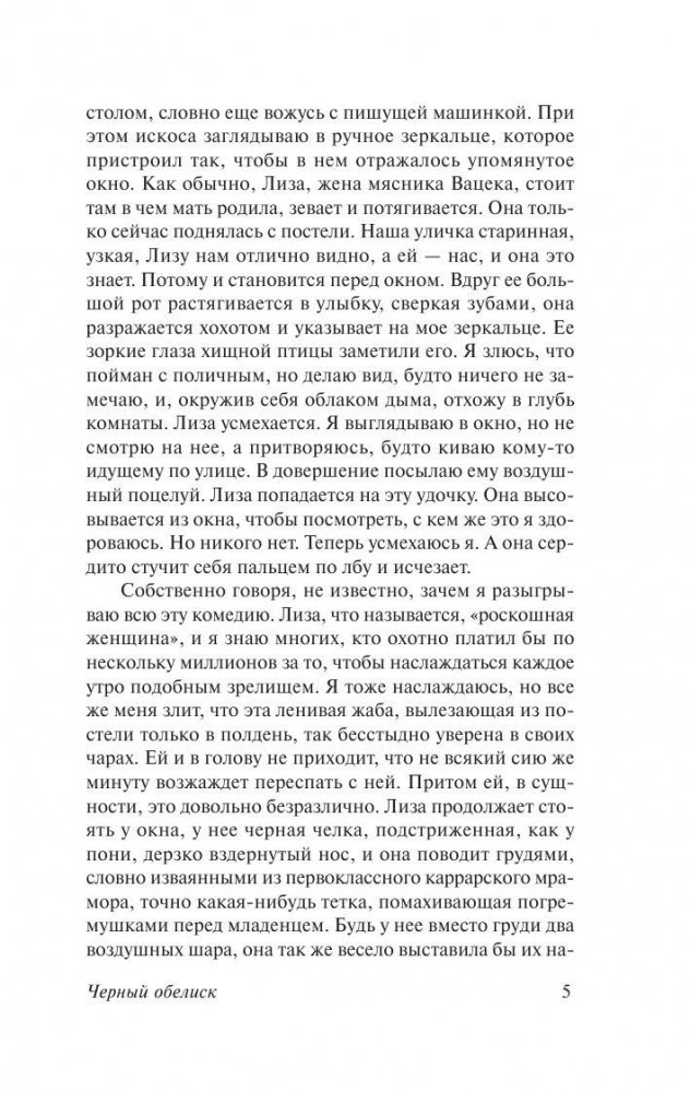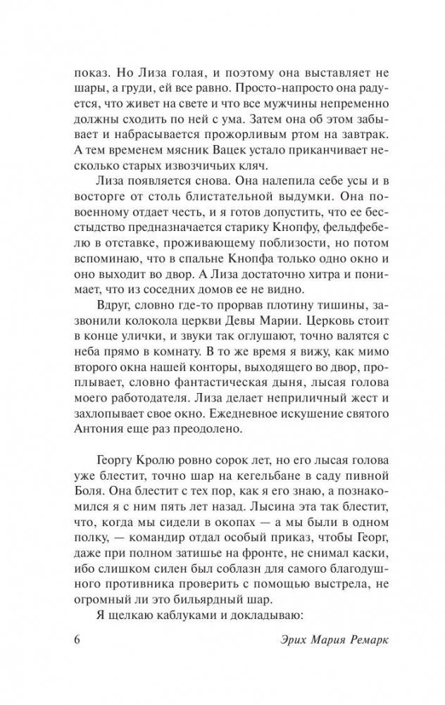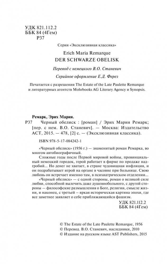 «Черный обелиск» (1956 г.) – знаменитый роман Ремарка, во многом автобиографичный. Сложные годы после Первой мировой войны, провинциальный немецкий городок, герой работает в фирме по продаже надгробий… Но денег не хватает, в стране чудовищная инфляция, и он подрабатывает игрой на органе в часовне при больнице. Свою любовь он встречает именно там, в психиатрическом отделении… «Черный обелиск» - с одной стороны, роман о великой силе любви, способной вылечить даже душевнобольного, с другой стороны – философские размышления о Боге, религии, смысле жизни, и наконец, с третьей – яркая историческая картина эпохи, где все заметнее заявляет о себе приближающийся фашизм.