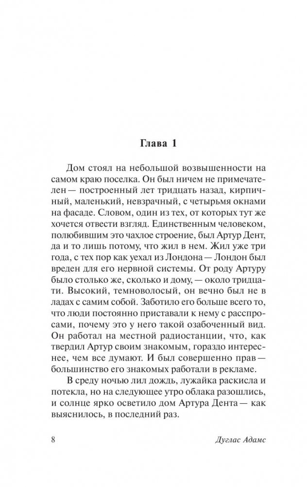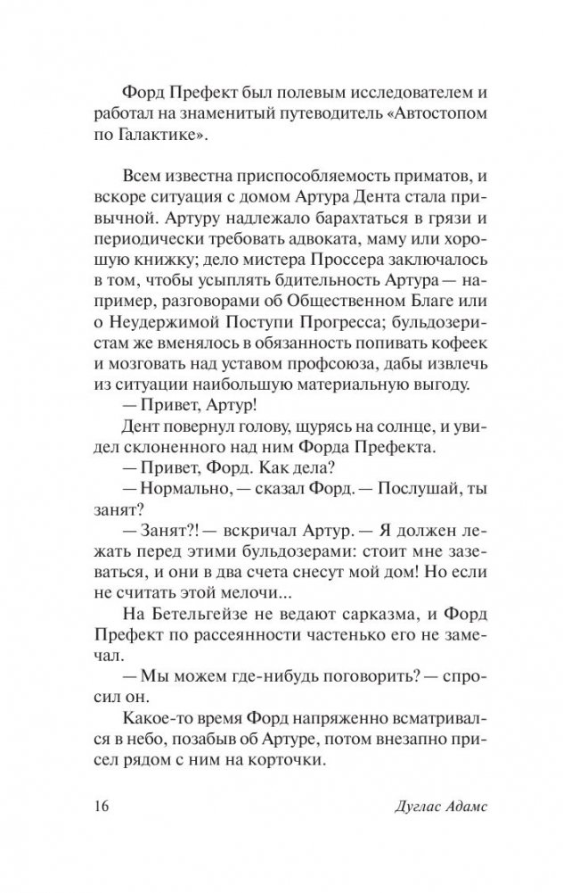 Дуглас Ноэль Адамс – английский писатель, драматург и сценарист, создавший один из самых оригинальных сериалов в фантастике. «Автостопом по галактике», стартовав в качестве радиопостановки на Би-би-си, имел грандиозный успех. Одноименный роман в 1984 году возглавил список английских бестселлеров, а сам Адамс стал самым молодым писателем, получившим награду «Золотая ручка», вручаемую за 1 млн. проданных книг. Телепостановка 1982 года упрочила успех серии книг про «Автостоп», а полнометражный фильм 2005 года при бюджете в $50 млн. дважды «отбил» расходы на экранизацию и был номинирован на 7 премий. Популярность сатирической «трилогии в пяти частях» выплеснулась в музыкальную и компьютерную индустрию. Так, группы Radiohead, Coldplay, NOFX используют цитаты из романа Адамса, а Level 42 названа в честь главной сюжетной линии романа. Герои не менее культового фильма «Люди в черном» беззастенчиво пользуются саркастическими диалогами персонажей Адамса.