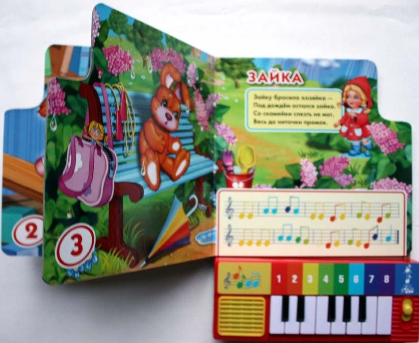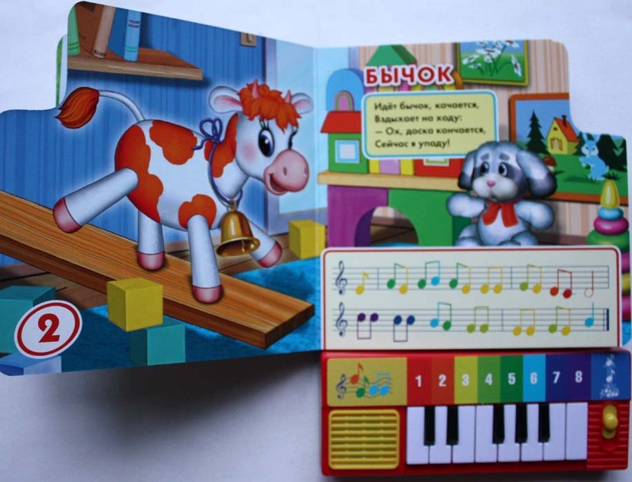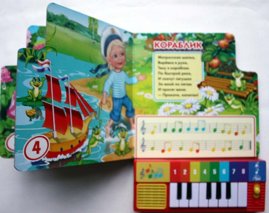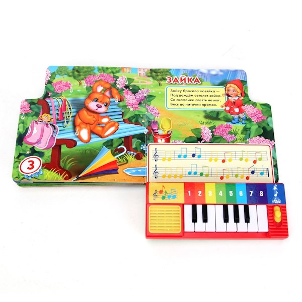 Книга-пианино с 8 клавишами и песенками. Формат: 143х202 мм. Объем: 10 стр.