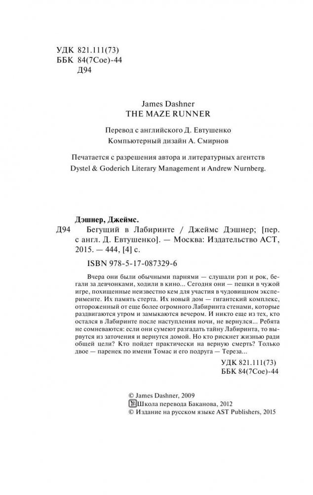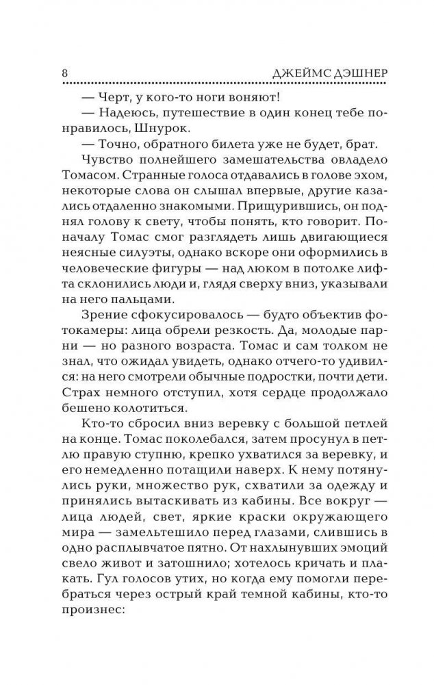 Вчера они были обычными парнями — слушали рэп и рок, бегали за девчонками, ходили в кино… Сегодня они — пешки в чужой игре, похищенные неизвестно кем для участия в чудовищном эксперименте. Их память стерта. Их новый дом — гигантский комплекс, отгороженный от еще более огромного Лабиринта стенами, которые раздвигаются утром и замыкаются вечером. И никто еще из тех, кто остался в Лабиринте после наступления ночи, не вернулся… Ребята не сомневаются: если они сумеют разгадать тайну Лабиринта, то вырвутся из заточения и вернутся домой. Но кто рискнет жизнью ради общей цели? Кто пойдет практически на верную смерть? Только двое — паренек по имени Томас и его подруга — Тереза…