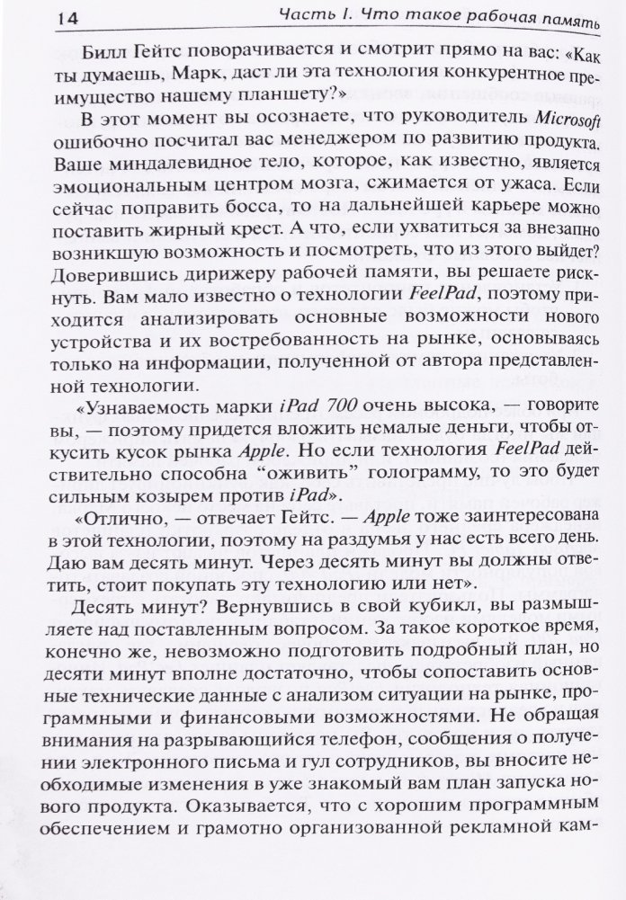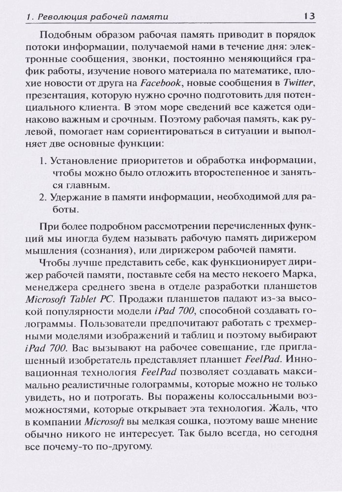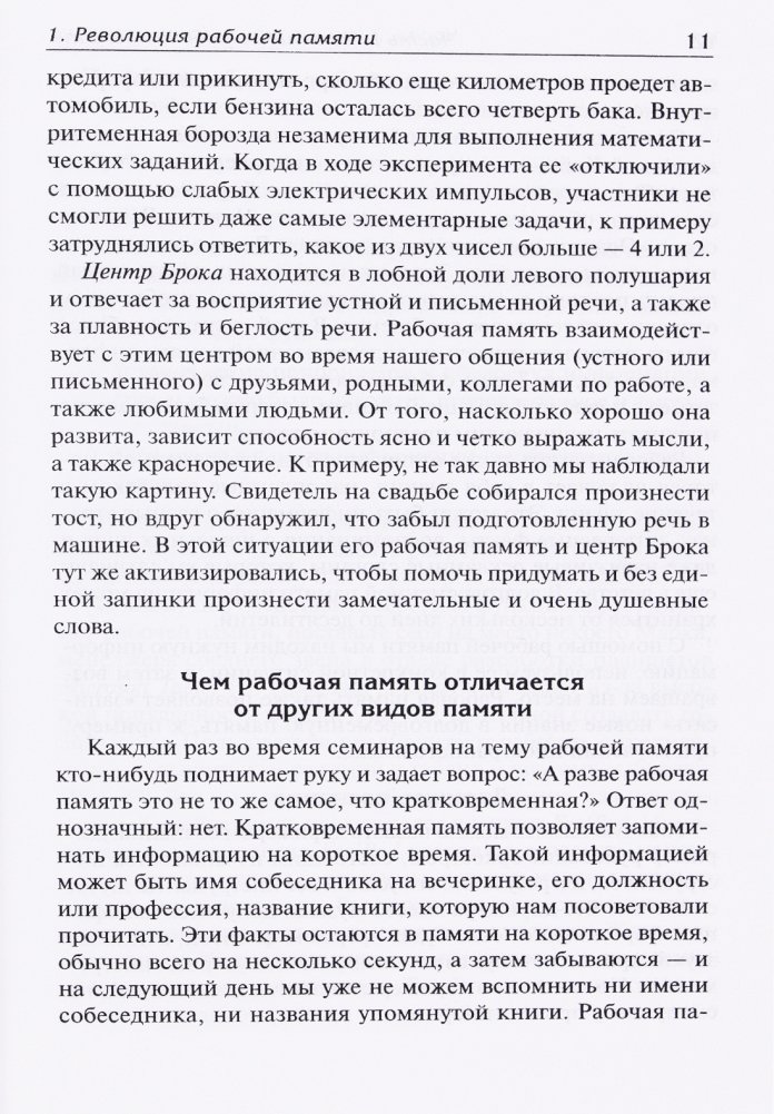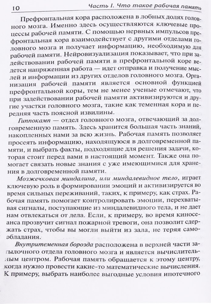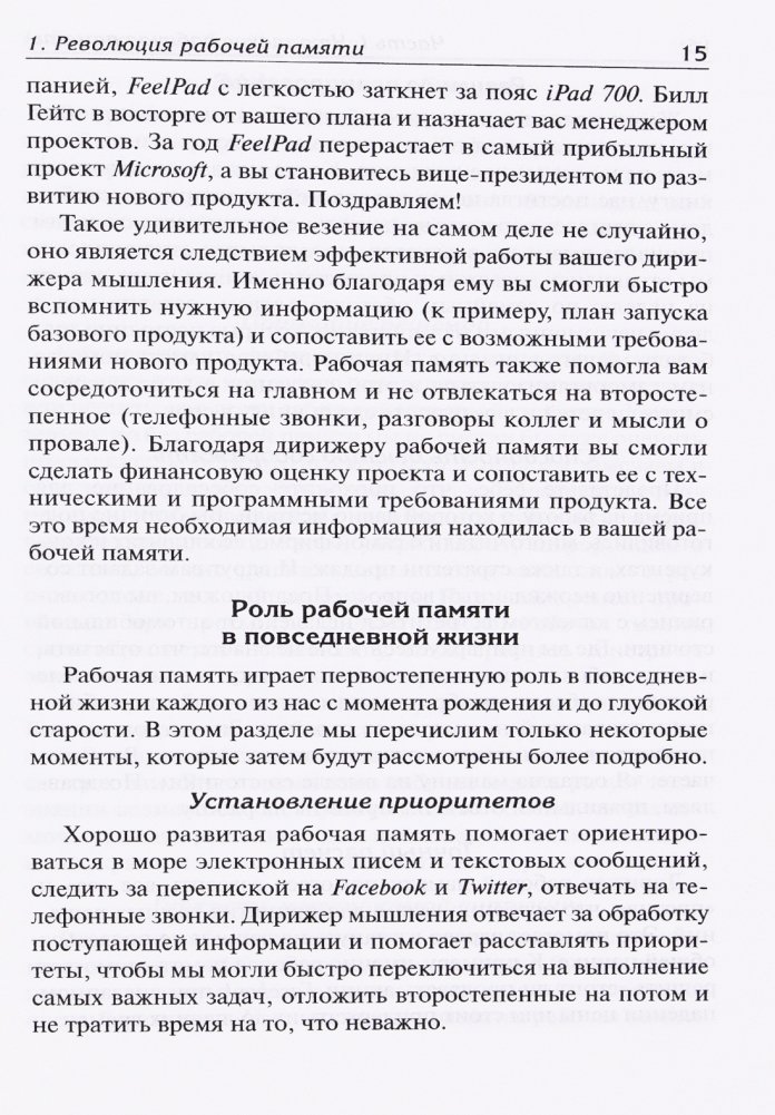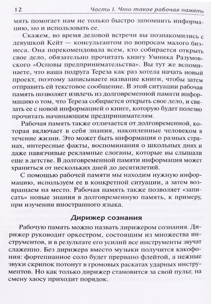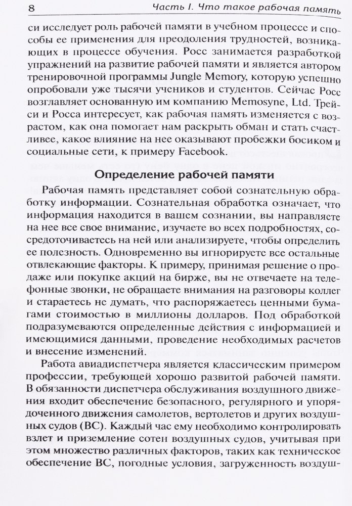 Основываясь на новейших научных исследованиях, авторы рассказывают, в чем польза Facebook, как повысить успеваемость в учебе и как наша память изменяется с возрастом. Вы узнаете, что рабочая память помогает облегчить такие серьезные состояния и заболевания, как гиперактивность, аутизм, дислексия и болезнь Альцгеймера. В книге также даются тесты на проверку памяти и более 50 упражнений на ее развитие и улучшение. Она знакомит с новейшими научными подходами, позволяющими значительно усовершенствовать и улучшить наши мыслительные способности. Для широкого круга читателей.