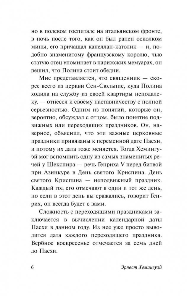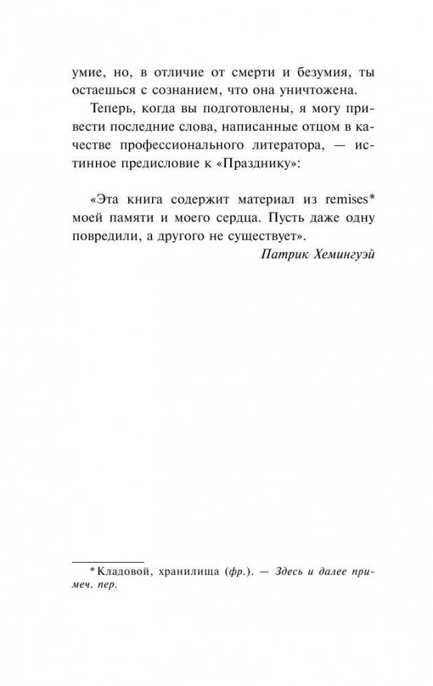 Париж «золотых двадцатых» для миллионов читателей всего мира навеки останется «Парижем Хемингуэя» — городом, где не имея за душой лишнего гроша можно жить, работать и быть счастливым. Десятилетиями это произведение публиковалось по его изданию 1964 года, вышедшему спустя три года после смерти писателя. Однако внук и сын писателя Шон и Патрик, проделав огромную работу, восстановили подлинный текст рукописи в том виде, в каком он существовал еще при жизни писателя. Теперь у читателя есть возможность познакомиться с тем «Праздником…», который хотел представить ему сам Эрнест Хемингуэй…