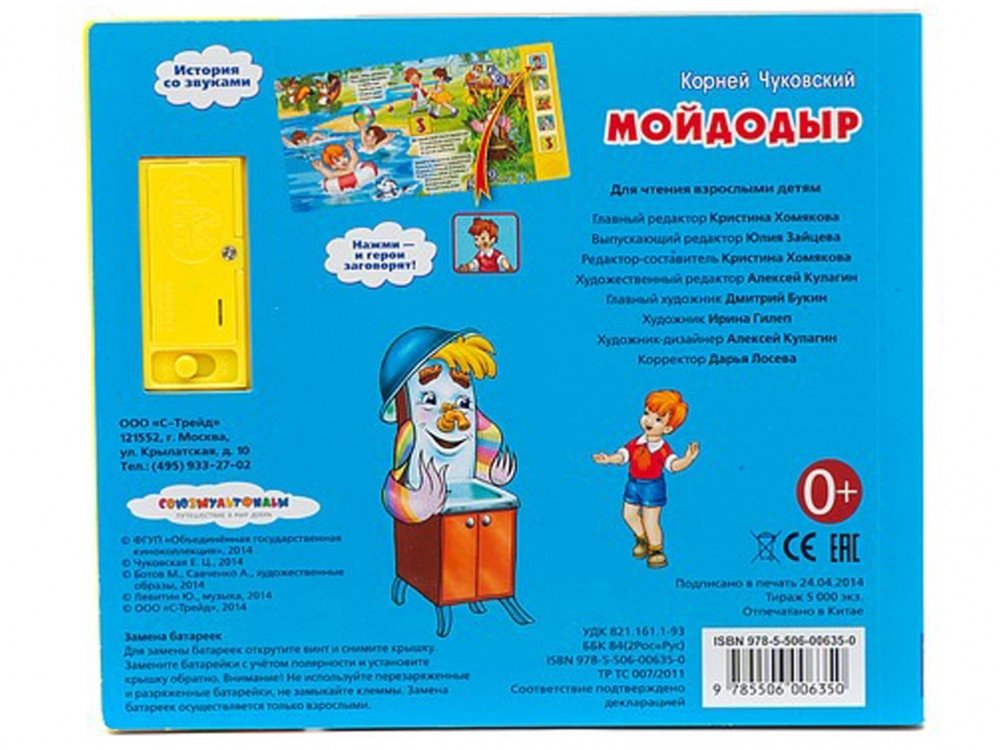Эта серия книг для первого чтения малышу предназначена для знакомства с популярными сказками, на которых выросло не одно поколение детей. Замечательная интересная книга с 5 звуковыми кнопками "Мойдодыр" по мотивам одноименной сказки К.И. Чуковского. В книге рассказана известная история. Малыш с удовольствием будет ее слушать или читать и при этом рассматривать яркие, красочные странички с любимыми героями. Также малыш при нажатии кнопок можно прослушать сказку. Ребёнок будет в восторге от такого подарка. Развивает память, воображение, фантазию, сенсорику.