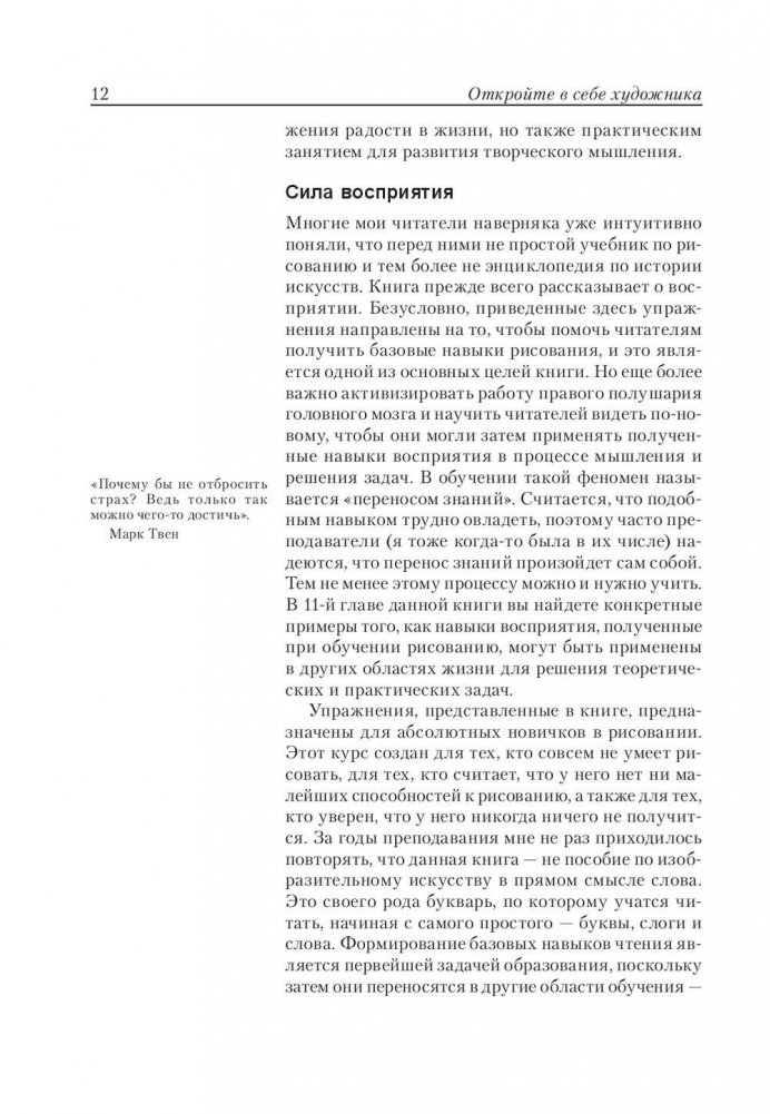 Изданная общим тиражом более 2,5 миллиона экземпляров и переведенная на семнадцать языков книга «Откройте в себе художника» является самым популярным в мире учебником рисования. Независимо от того, считаете ли вы, что не имеете способностей к рисованию и вам не под силу овладеть этим искусством, или любите рисовать, но никак не можете подняться выше детского уровня, эта книга объяснит, как выработать навыки, которых вам недостает. Даже если вы рисуете на профессиональном уровне, она поможет вам обрести больше уверенности в своих способностях и углубить навыки художественного восприятия. Для широкого круга начинающих художников-графиков.