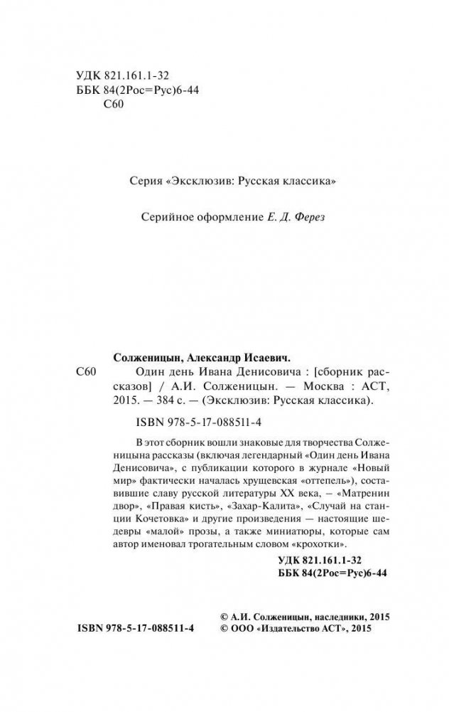 В этот сборник вошли знаковые для творчества Солженицына рассказы (включая легендарный «Один день Ивана Денисовича», с публикации которого в журнале «Новый мир» фактически началась хрущевская «оттепель»), составившие славу русской литературы ХХ века – «Матренин двор», «Правая кисть», «Захар-Калита», «Случай на станции Кочетовка» и другие произведения — настоящие шедевры «малой» прозы, а также миниатюры, которые сам автор именовал трогательным словом «крохотки».