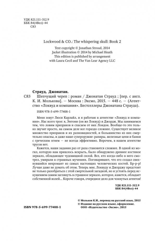 Меня зовут Люси Карлайл и я работаю в агентстве "Локвуд и компания". Нас всего трое: я, Энтони (он же Локвуд) и Джордж. Мы занимаемся тем, что ловим призраков и спасаем от них Лондон. Вообще-то, это только звучит просто, на самом деле все гораздо сложнее. Существует великое множество призраков и их разновидностей, и большинство из них смертельно опасны, и даже наше супероружие: рапиры, железные цепи и банки с греческим огнем - не всегда эффективно. Впрочем, в нашем агентстве трусов нет. Кажется, наши задания раз от раза становятся сложнее. В одной из могил, которую нам пришлось вскрыть, было обнаружено древнее костяное зеркало, обладающее чудовищной силой. Все, кто когда либо в него смотрел, умирали в страшных мучениях. Поговаривают, что его создал свихнувшийся некромант из самых настоящих человеческих костей. Бр-р-р! Лучше даже не думать об этом. Теперь мне, Локвуду и Джорджу предстоит не только разобраться с этой смертельной загадкой, но и устоять перед искушением самим заглянуть в страшное зеркало, которое, кажется, обладает собственной волей. Короче говоря, очередное дело для чокнутых агентов!