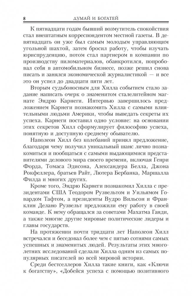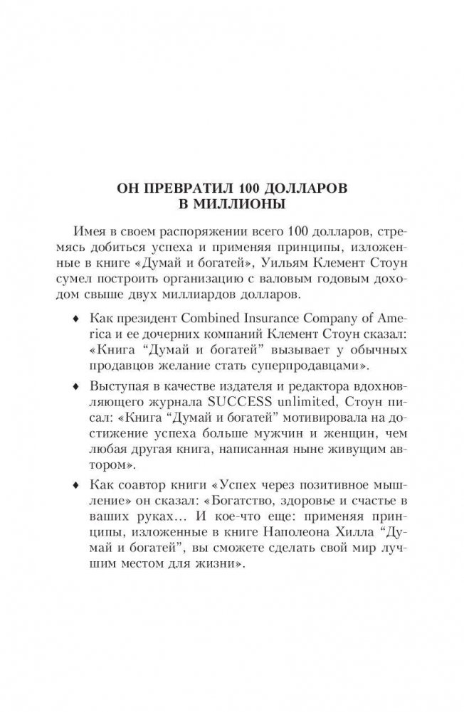 Служащая стандартом для мотивационной литературы книга ;Думай и богатей давно получила статус непревзойденного классического учебника. Ее текст укомплектован кратким, но доступным и исчерпывающим руководством по изучению и применению блестящих и плодотворных идей автора. Освоив сполна (и теоретически, и практически) эту важную книгу, вы сумеете достичь успеха на пути к богатству и счастью. Для широкого круга читателей.