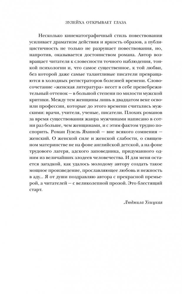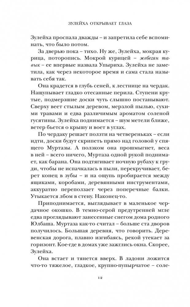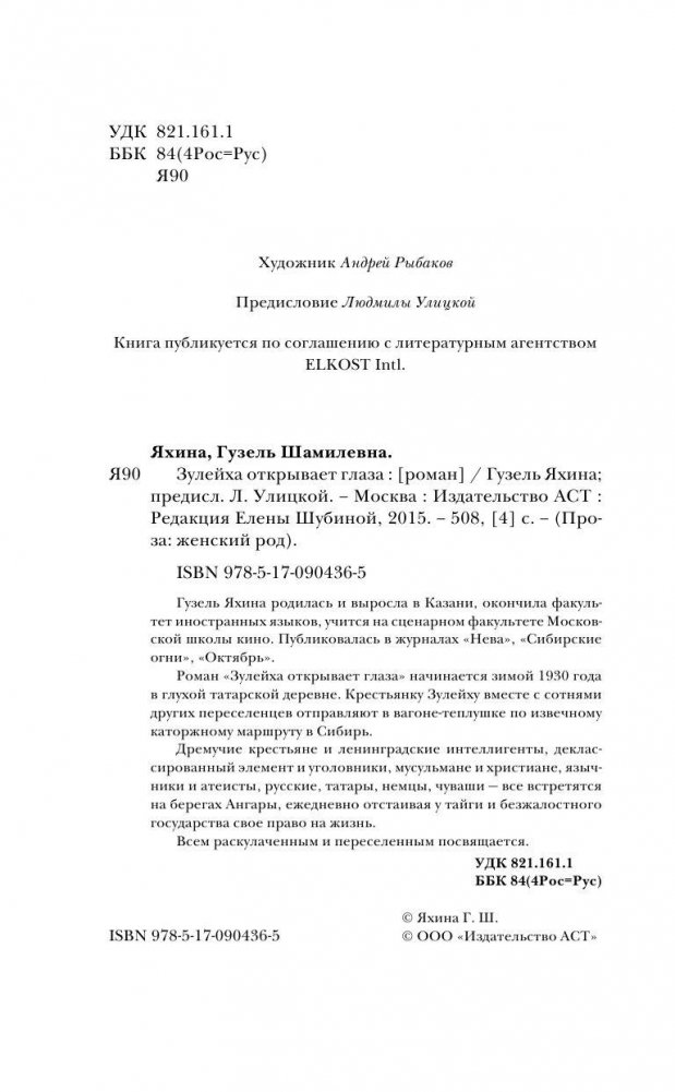 Гузель Яхина родилась и выросла в Казани, окончила факультет иностранных языков, учится на сценарном факультете Московской школы кино. Публиковалась в журналах «Нева», «Сибирские огни», «Октябрь». Роман «Зулейха открывает глаза» начинается зимой 1930 года в глухой татарской деревне. Крестьянку Зулейху вместе с сотнями других переселенцев отправляют в вагоне-теплушке по извечному каторжному маршруту в Сибирь. Дремучие крестьяне и ленинградские интеллигенты, деклассированный элемент и уголовники, мусульмане и христиане, язычники и атеисты, русские, татары, немцы, чуваши — все встретятся на берегах Ангары, ежедневно отстаивая у тайги и безжалостного государства свое право на жизнь. Всем раскулаченным и переселенным посвящается.