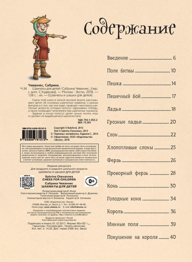 Уникальная книга, которая в увлекательной игровой форме обучает детей базовым правилам игры в шахматы. Авторские иллюстрации, обаятельные персонажи, интересный сюжет, оригинальные задачи, смешные шутки- все в этой книге способствует легкому освоению хитростей игры. Предназначена для детей 4-х лет, так и для их родителей. Автором является тренер британской юниорской команды по шахматам.
