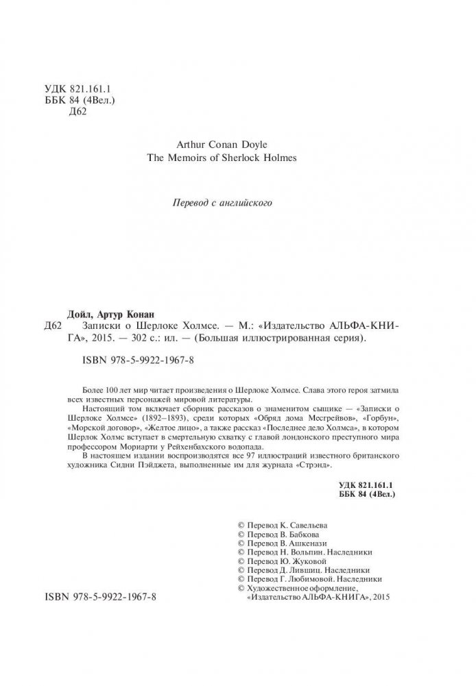 Более 100 лет мир читает произведения о Шерлоке Холмсе. Слава этого героя затмила всех известных персонажей мировой литературы. Настоящий том включает сборник рассказов о знаменитом сыщике — «Записки о Шерлоке Холмсе» (1892—1893), среди которых «Обряд дома Месгрейвов», «Горбун», «Морской договор», «Желтое лицо», а также рассказ «Последнее дело Холмса», в котором Шерлок Холмс вступает в смертельную схватку с главой лондонского преступного мира профессором Мориарти у Рейхенбахского водопада. В настоящем издании воспроизводятся все 97 иллюстраций известного британского художника Сидни Пэйджета, выполненные им для журнала «Стрэнд».