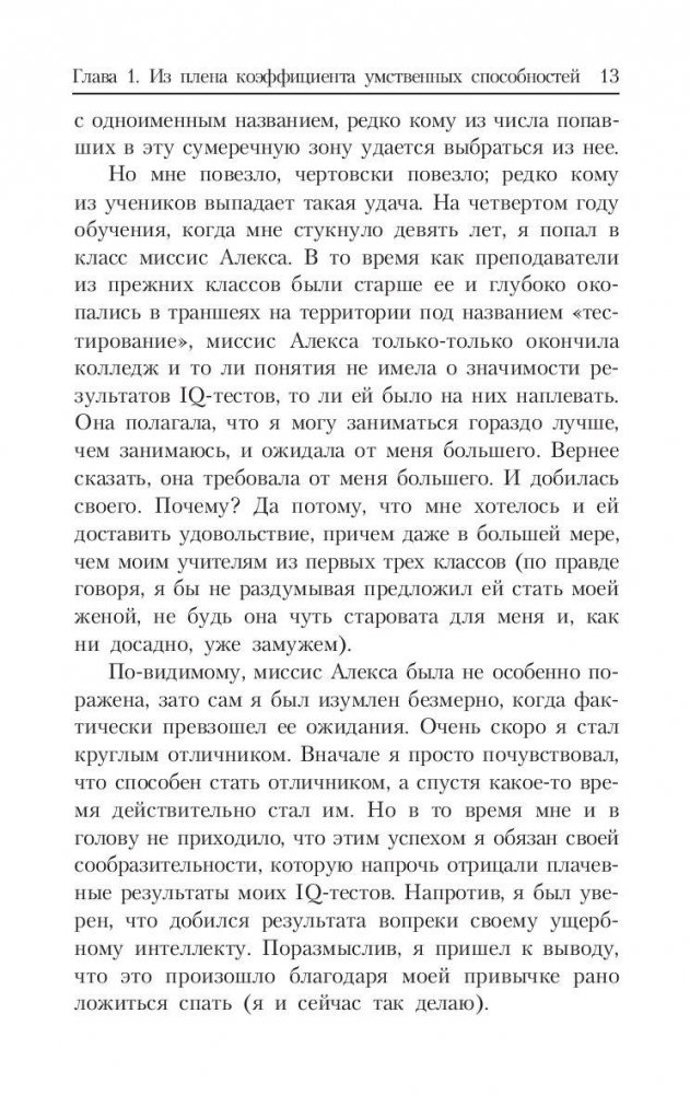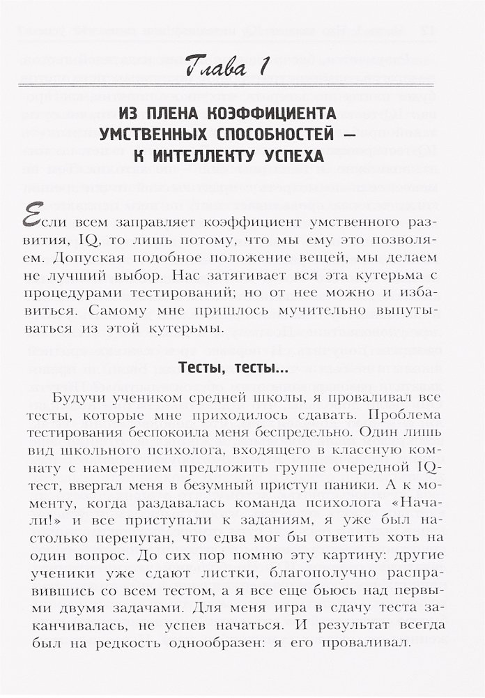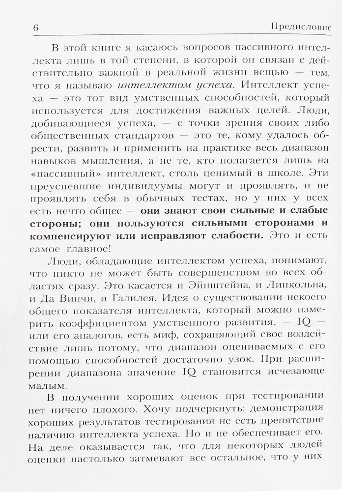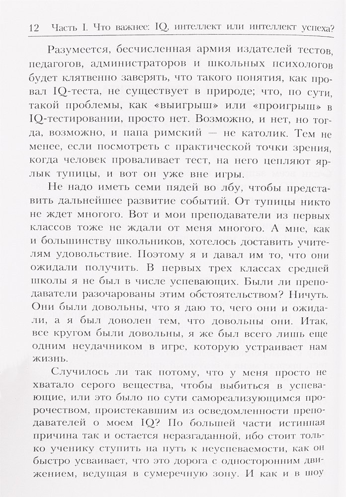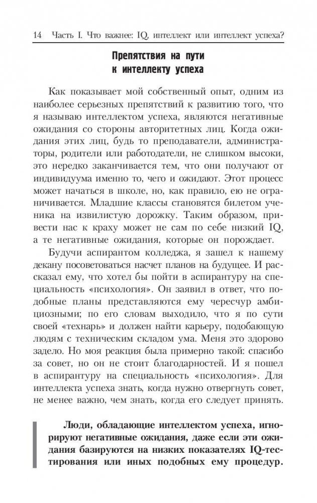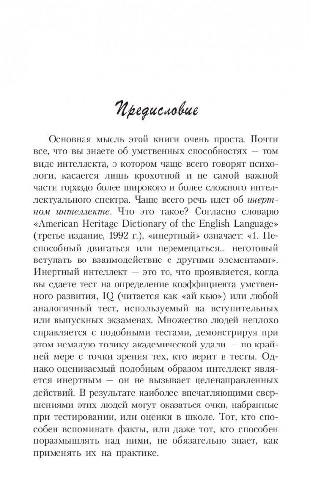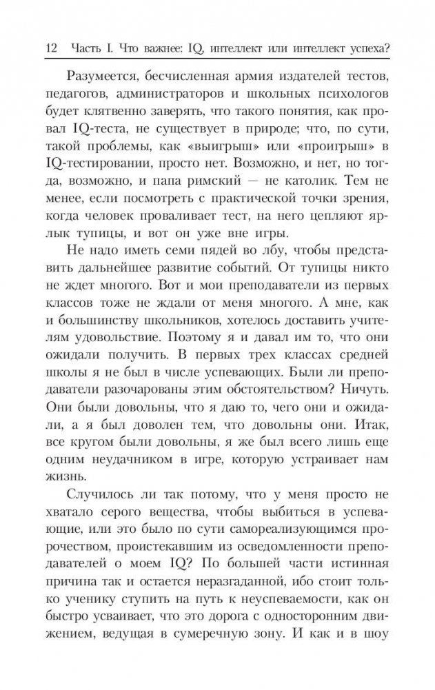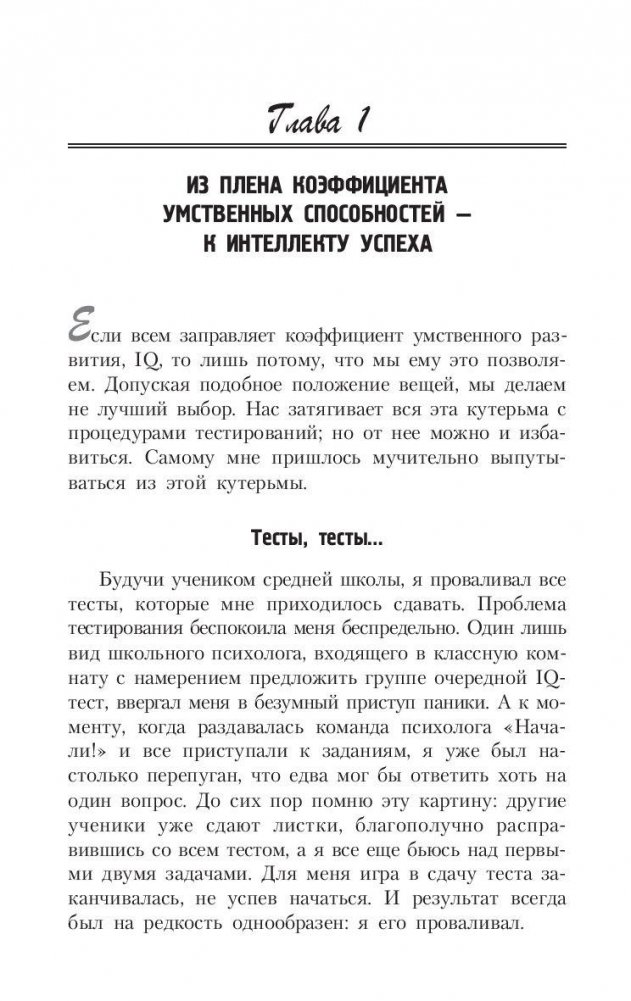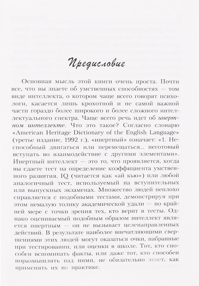 Профессор психологии и образования из Йельского университета доказывает на страницах этой книги, что важнейшей предпосылкой успеха в реальной жизни является так называемый "прикладной" (созидательный) интеллект. Подробно поясняются его отличия от "академического", измеряемого коэффициентом IQ в разнообразных тестах, и от "эмоционального" интеллекта, устремленного прежде всего на межличностные отношения. Обсуждаются три составные части созидательного интеллекта, выражаемые в трех способностях человека: творить (изобретать) нечто новое, осуществлять (воплощать) идею, анализировать результат, обстановку, ситуацию. Для широкого круга читателей.
