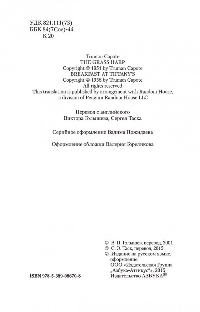 Вниманию читателя предлагаются две его классические повести: лирические «Голоса травы», публикующиеся в новом переводе, а также «Завтрак у Тиффани» — самое знаменитое произведение Капоте, прославленное в 1961 году экранизацией с Одри Хепберн в главной роли, сыгравшей главную героиню повести Холли Голайтли, одну из самых ярких и необычных женщин американской литературы.