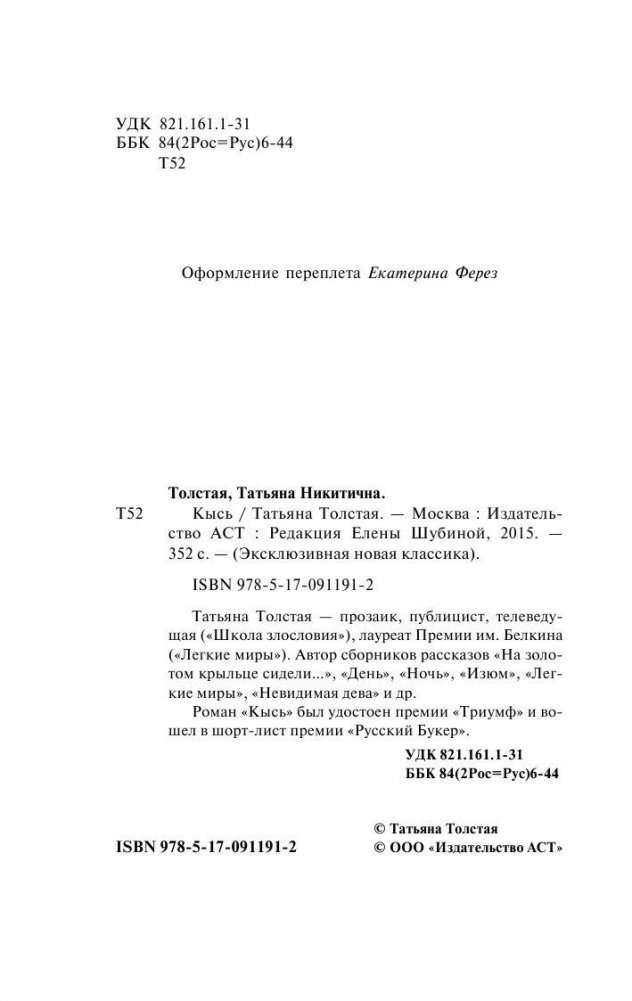 Татьяна Толстая — прозаик, публицист, телеведущая («Школа злословия»), лауреат Премии им. Белкина («Легкие миры»). Автор сборников рассказов «На золотом крыльце сидели…», «День», «Ночь», «Изюм», «Легкие миры», «Невидимая дева» и др. Роман «Кысь» был удостоен премии «Триумф» и вошел в шорт-лист премии «Русский Букер».