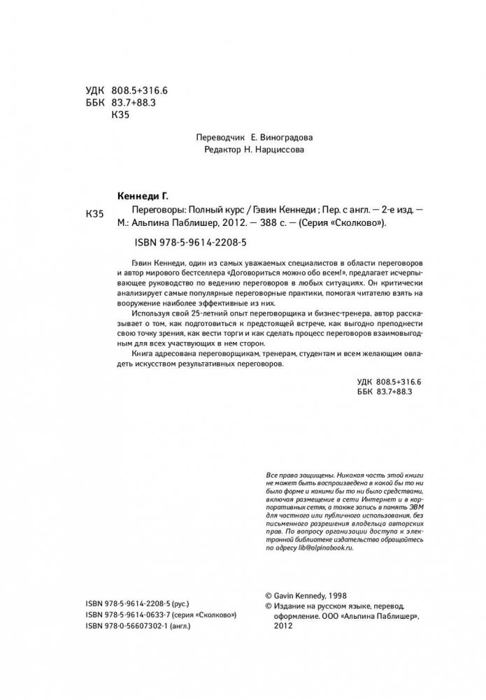 Гэвин Кеннеди, один из самых уважаемых специалистов в области переговоров и автор мирового бестселлера «Договориться можно обо всем!», предлагает исчерпывающее руководство по ведению переговоров в любых ситуациях. Он критически анализирует самые популярные переговорные практики, помогая читателю взять на вооружение наиболее эффективные из них. Используя свой 25-летний опыт переговорщика и бизнес-тренера, автор рассказывает о том, как подготовиться к предстоящей встрече, как выгодно преподнести свою точку зрения, как вести торги и как сделать процесс переговоров взаимовыгодным для всех участвующих в нем сторон. Книга адресована переговорщикам, тренерам, студентам и всем желающим овладеть искусством результативных переговоров.