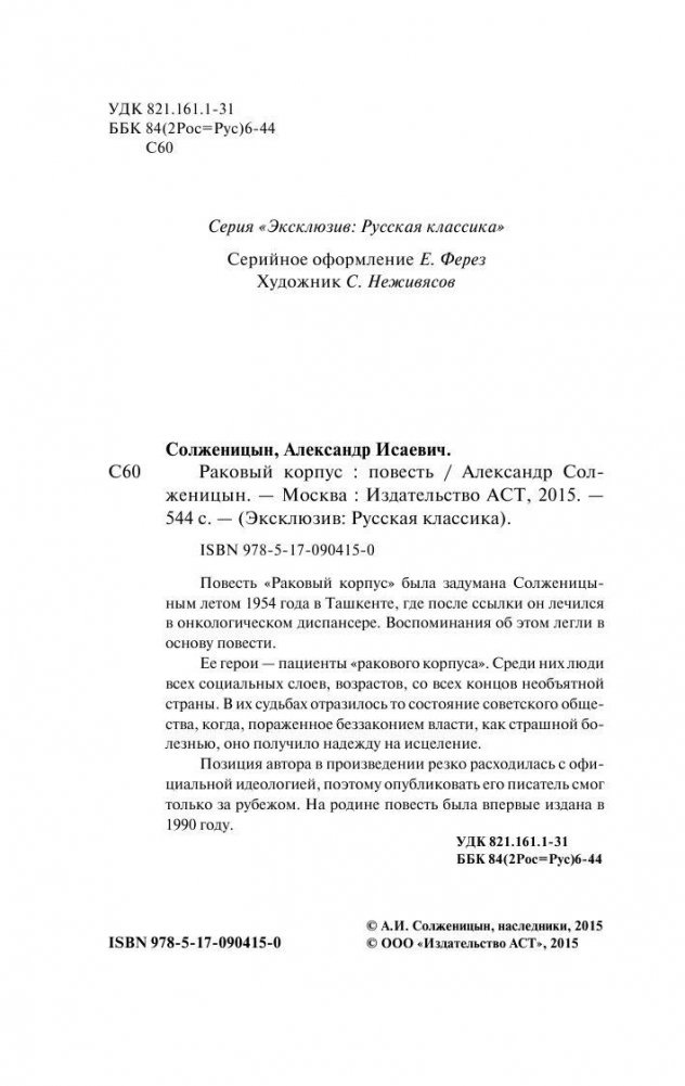 Повесть "Раковый корпус" была задумана Солженицыным летом 1954 года в Ташкенте, где после ссылки он лечился в онкологическом диспансере. Воспоминания об этом легли в основу повести. Ее герои — пациенты "ракового корпуса". Среди них люди всех социальных слоев, возрастов со всех концов необъятной страны. В их судьбах отразилось то состояние советского общества, когда, пораженное беззаконием власти, как страшной болезнью, оно получило надежду на исцеление. Позиция автора в произведении резко расходилась с официальной идеологией, поэтому опубликовать его писатель смог только за рубежом. На родине повесть была впервые издана в 1990 году.