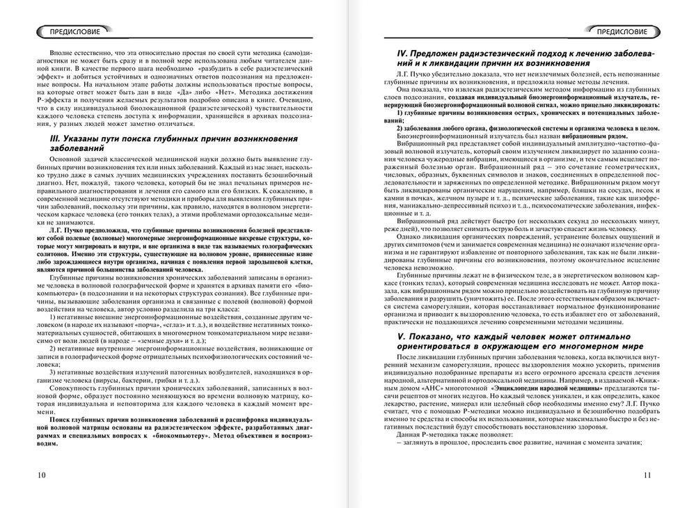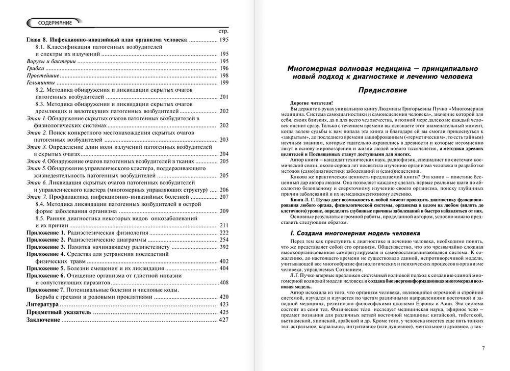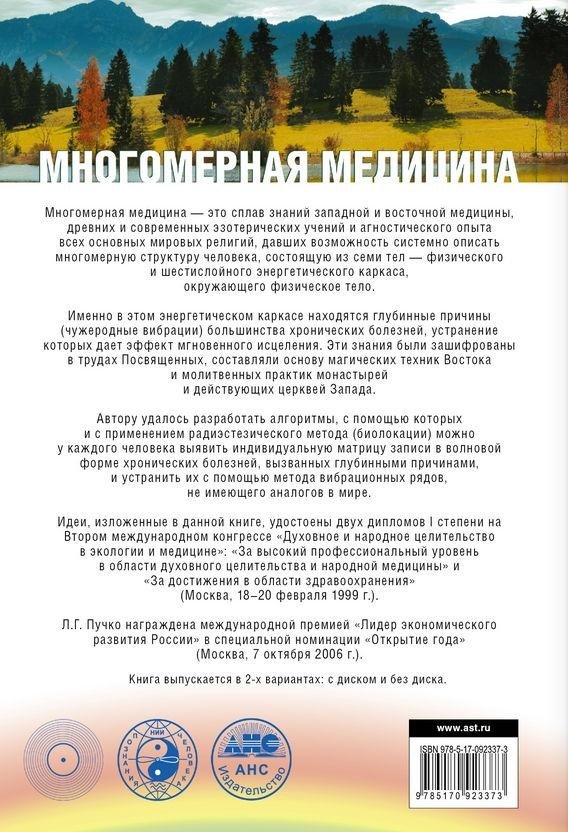 Многомерная медицина — это сплав знаний западной и восточной медицины, древних и современных эзотерических учений и агностического опыта всех основных мировых религий, давших возможность системно описать многомерную структуру человека, состоящую из семи тел — физического и шестислойного энергетического каркаса, окружающего физическое тело. Именно в этом энергетическом каркасе находятся глубинные причины (чужеродные вибрации) большинства хронических болезней, устранение которых дает эффект мгновенного исцеления. Эти знания были зашифрованы в трудах Посвященных, составляли основу магических техник Востока и молитвенных практик монастырей и действующих церквей Запада. Автору удалось разработать алгоритм, с помощью которого и с применением радиоэстезического метода (биолокации) можно у каждого человека выявить индивидуальную матрицу записи в волновой форме хронических болезней, вызванных глубинными причинами, и устранить их с помощью метода вибрационных рядов, не имеющего аналогов в мире.