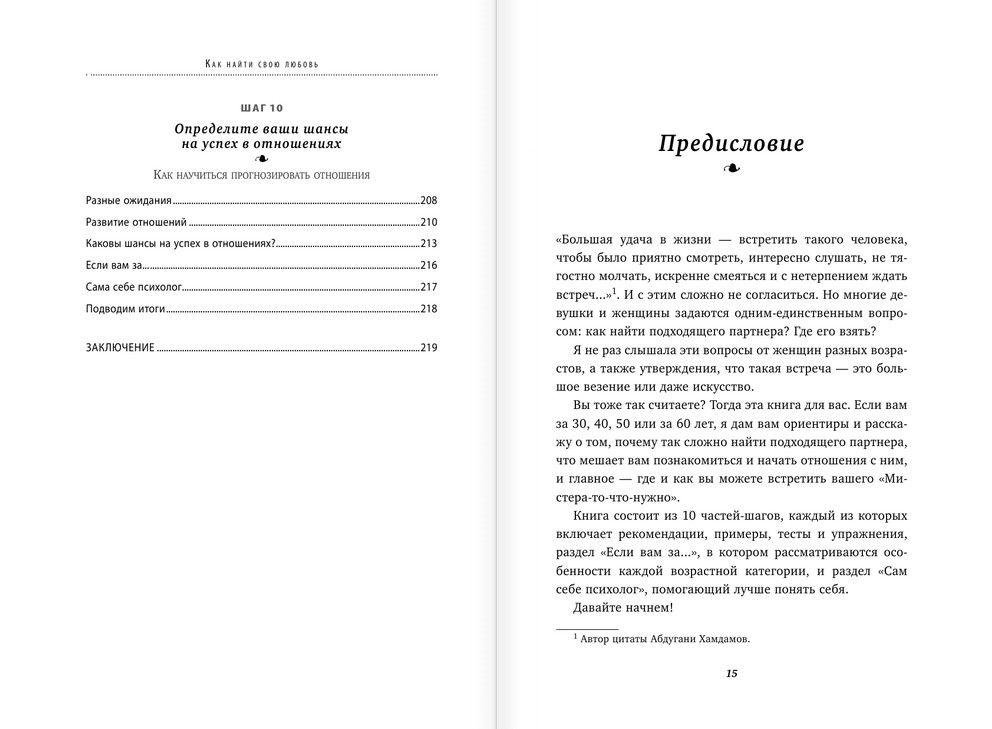 О чем эта книга: Встретить взаимную любовь можно в любом возрасте. Если вы не привыкли полагаться исключительно на везение и случай, эта книга-тренинг – для вас. Опытный психолог представляет полноценную программу работы над собой и решения проблем личной жизни. С помощью книги вы: - проработаете свой имидж, чтобы стать привлекательнее; - повысите самооценку и будете более уверенной в себе; - избавитесь от ложных установок и груза прошлых отношений; - поймете, в каких отношениях вам будет комфортнее всего сейчас; - узнаете, где и как познакомиться с подходящим партнером; - избежите при продолжении общения ошибок, которые совершают многие; - построите надежные отношения, о которых мечтали всю жизнь. Для кого эта книга: Для женщин, преимущественно от 30 лет. Кто автор: Надежда Либерман — психолог-консультант с двумя высшими психологическими образованиями и большим опытом работы в России и Германии. Занимаясь с 2006 года частной практикой, помогает людям решать их проблемы в личной и семейной жизни. Живет и работает в г. Дюссельдорфе. Особенности книги: - Книга-тренинг для тех, у кого нет возможности посещать «живые» тренинги. - Автор – опытный практикующий психолог. - Множество тестов и упражнений, которые помогут лучше понять себя и решить личные проблемы. - Эффективные советы и рекомендации для женщин разного возраста, с учетом их желаний и потребностей. Отзывы: "Если женщине исполнилось 30 лет, или 40, или 50, или 60, а она одинока, поиск «подходящего» мужчины может представлять определенную трудность. Это, увы, факт. Занимательные психологические тесты и пошаговые инструкции этой книги если и не сработают напрямую, то помогут разобраться в своих отношениях с противоположным полом". Наталья Горбунова, ведущий редактор журнала "Лиза". "Очень важно, что книга не написана в ключе «для всех, кому за 30». Ведь потребности и стремления у женщин 30, 40, 50 лет могут заметно различаться. Все рекомендации даны для конкретной возрастной категории". Ольга Маховская, психолог, писатель.