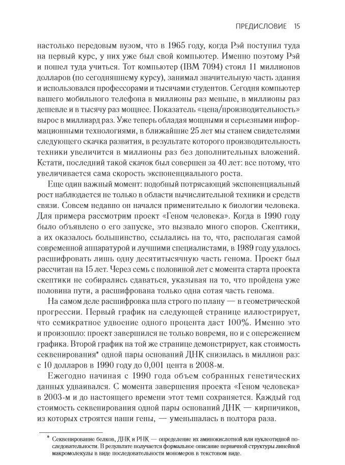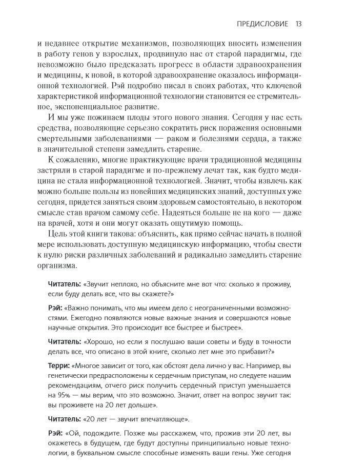 Научно обоснованная программа, которая позволит прожить достаточно долго, чтобы жить вечно. Известный футуролог Рэй Курцвейл и доктор медицины Терри Гроссман исследовали тысячи научных работ, чтобы убедиться, что новые исследования в медицине и технологии позволят нам существенно увеличить длительность жизни и замедлить процесс старения. В этой книге они предлагают практические шаги, которые позволят вам жить достаточно долго (и оставаться при этом здоровым), чтобы в перспективе сполна воспользоваться новейшими био- и нанотехнологиями, которые позволят продлить жизнь кардинально и о которых Курцвейл — один из самых известных футурологов мира — знает больше, чем кто-либо другой.