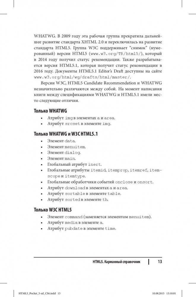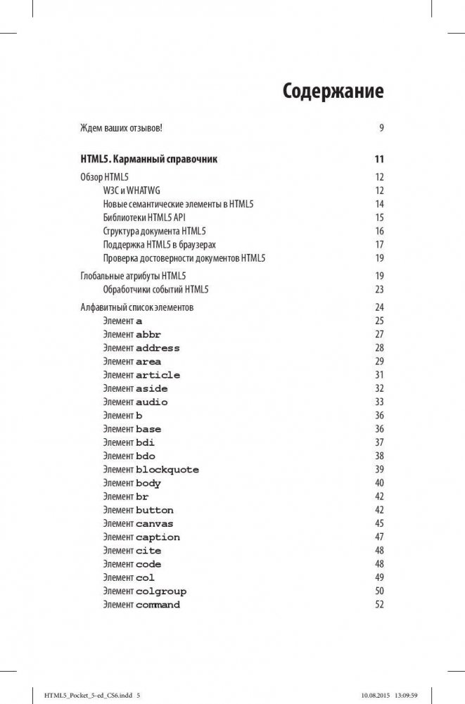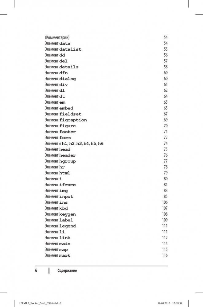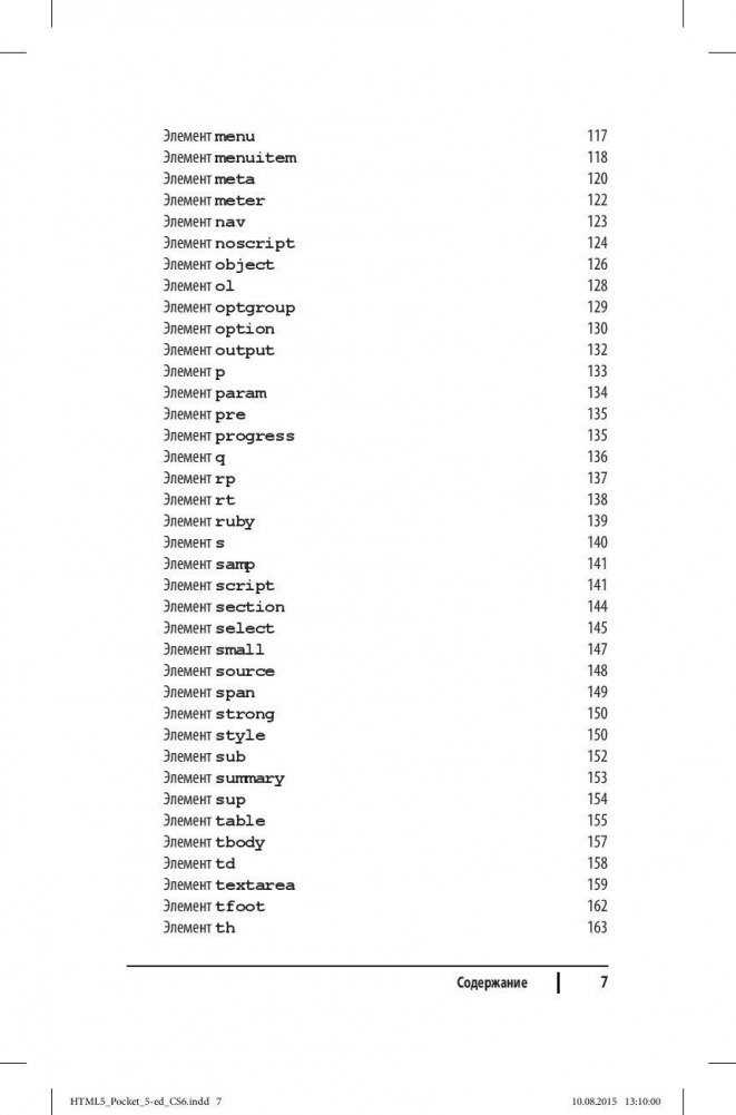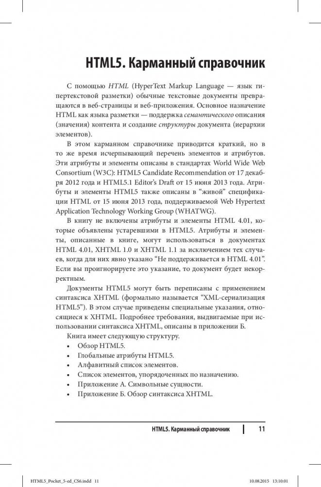 Хотите быстро найти описание элемента или атрибута HTML5, используемого на веб-странице или в веб-приложении? Перед вами классический справочник, который веб-дизайнеры и веб-разработчики стараются всегда держать под рукой на протяжении вот уже более 15 лет. Пятое издание книги включает полное описание элементов и атрибутов HTML5 в соответствии со стандартами HTML5 Candidate Recommendation, HTML5.1 Working Draft и WHATWG.