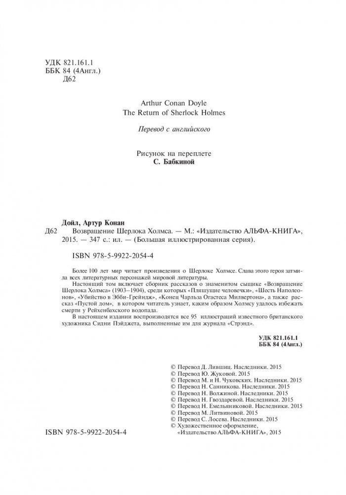 Более 100 лет мир читает произведения о Шерлоке Холмсе. Слава этого героя затмила всех литературных персонажей мировой литературы. Настоящий том включает сборник рассказов о знаменитом сыщике «Возвращение Шерлока Холмса» (1903—1904), среди которых «Пляшущие человечки», «Шесть Наполеонов», «Убийство в Эбби-Грейндж», «Конец Чарльза Огастеса Милвертона», а также рассказ «Пустой дом», в котором читатель узнает, каким образом Холмсу удалось избежать смерти у Рейхенбахского водопада. В настоящем издании воспроизводятся все 95 иллюстраций известного британского художника Сидни Пэйджета, выполненные им для журнала «Стрэнд».