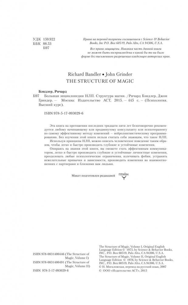 Эта работа на протяжении последних тридцати лет остается лучшей книгой о самом эффективном методе изменений — нейро-лингвистическом программировании — и безоговорочно рекомендуется любому начинающему или продвинутому консультанту или психотерапевту. Используя принципы НЛП, можно описать человеческое поведение таким образом, чтобы легко и быстро производить глубокие и устойчивые изменения. Если вы будете читать эту книгу так, как предлагают авторы, то полученные знания дадут вам ясную и четкую стратегию для вашей психотерапевтической работы, и вы сможете научиться преодолевать любые психологические ограничения, излечивать фобии, устранять нежелательные привычки и зависимости, производить изменения во взаимоотношениях с партнерами.