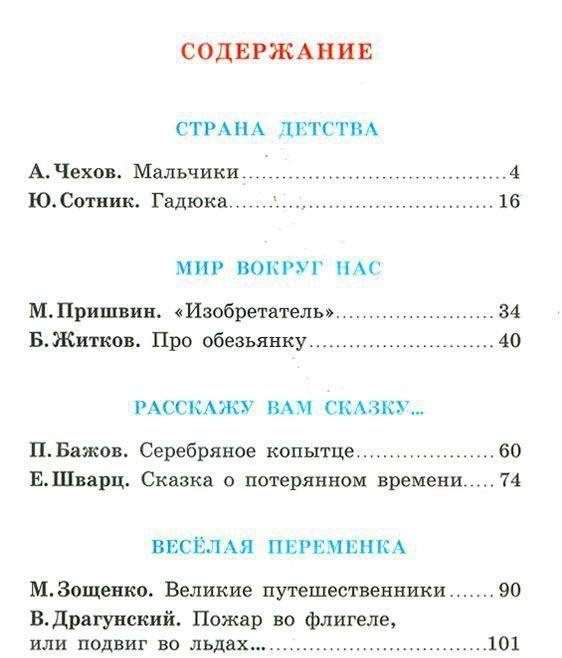 Для младшего школьного возраста. В сборник вошли рекомендованные для прочтения в 3 классе лучшие детские произведения классиков русской литературы: А. Чехова, Ю. Сотника, М.Пришвина, Б. Житкова, П. Бажова, Е. Шварца, М. Зощенко, В. Драгунского. Художник: Владимир Черноглазов. Все произведения публикуются без сокращений, каждое проиллюстрировано несколькими рисунками, что делает прочтение книги полезным и приятным для детей.