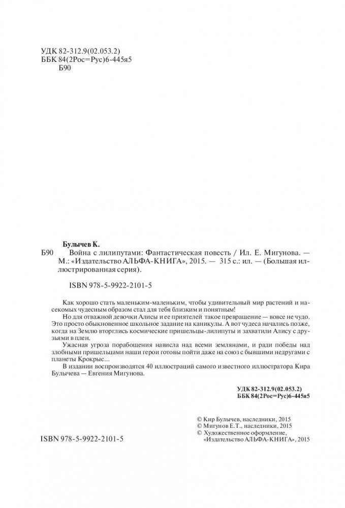 Как хорошо стать маленьким-маленьким, чтобы удивительный мир растений и насекомых чудесным образом стал для тебя близким и понятным! Но для отважной девочки Алисы и ее приятелей такое превращение — вовсе не чудо. Это просто обыкновенное школьное задание на каникулы. А вот чудеса начались позже, когда на Землю вторглись космические пришельцы-лилипуты и захватили Алису с друзьями в плен. Ужасная угроза порабощения нависла над всеми землянами, и ради победы над злобными пришельцами наши герои готовы пойти даже на союз с бывшими недругами с планеты Крокрыс... В издании воспроизводятся 40 иллюстраций самого известного иллюстратора Кира Булычева — Евгения Мигунова.