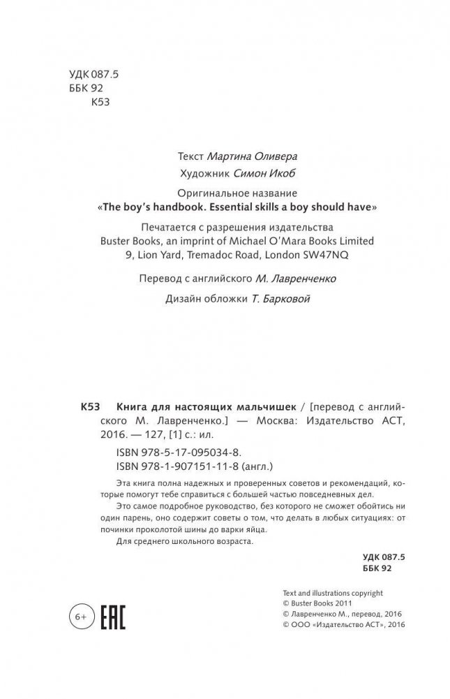 Эта книга полна надежных и проверенных советов и рекомендаций, которые помогут тебе справиться с большей частью повседневных дел. Это самое подробное руководство, без которого не сможет обойтись ни один парень, оно содержит советы о том, что делать в любых ситуациях: от починки проколотой шины до варки яйца. Для детей среднего школьного возраста.