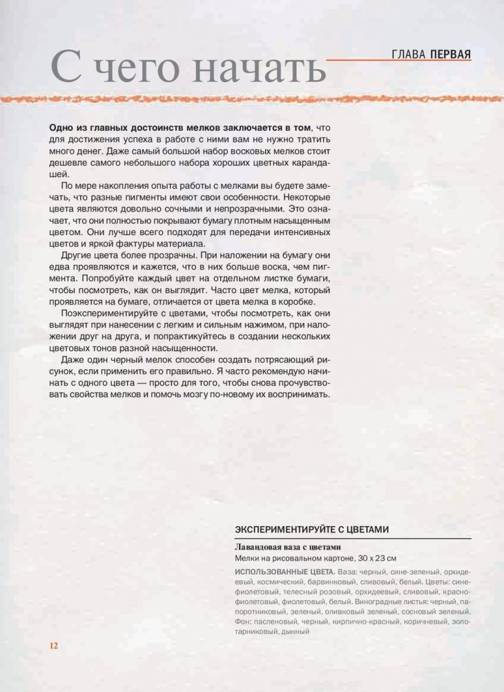 В своей уникальной книге художник и автор бестселлеров Ли Хэммонд доказывает, что мелки способны служить не только детской забавой, но и сказать собственное слово в качестве серьезного художественного средства. Она предлагает легкий метод создания впечатляющих рисунков, которые с невероятным правдоподобием передают цвета и текстуры. Для широкого круга читателей.