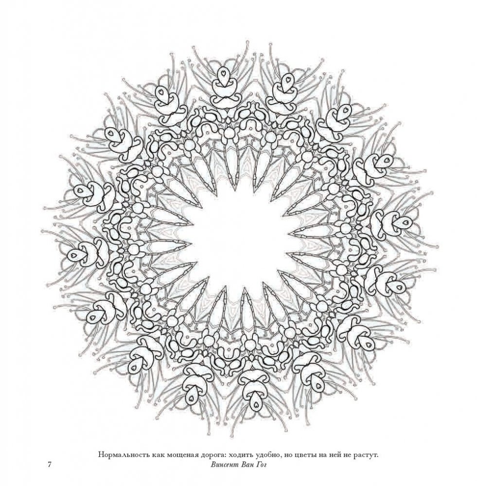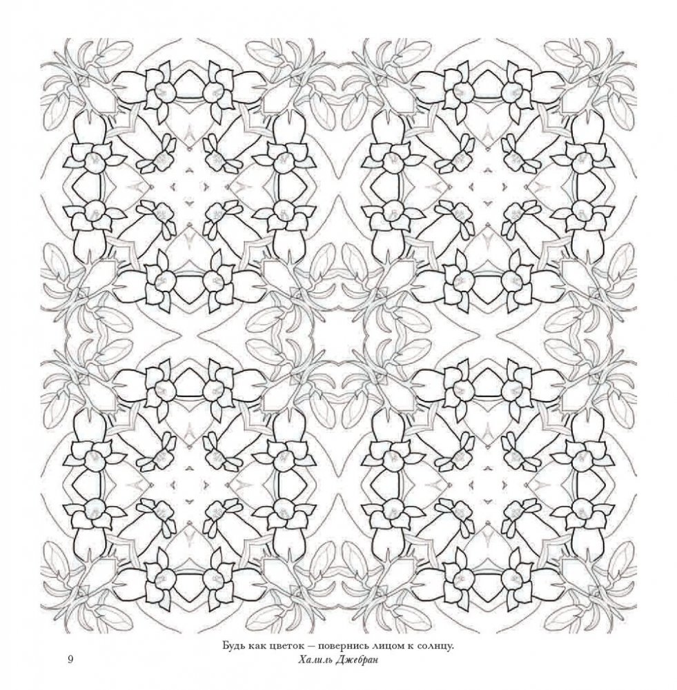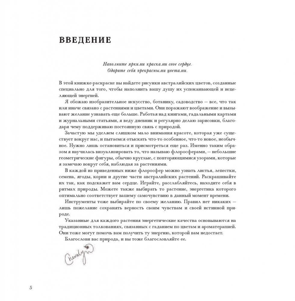 В этом альбоме вы найдете рисунки, созданные специально для того, чтобы наполнить вас вдохновляющей и исцеляющей энергией цветов. Геометрический калейдоскоп представленных здесь орнаментов заряжен красотой и творческой энергией природы. В их основе - удивительные растения, которые можно встретить в разных уголках Австралии: в пустынях, тропических лесах, на равнинах, в горах и на побережье. Раскрашивайте эти волшебные узоры фломастерами, карандашами, красками - чем угодно, лишь бы это успокаивало ваш ум и вдохновляло сердце.