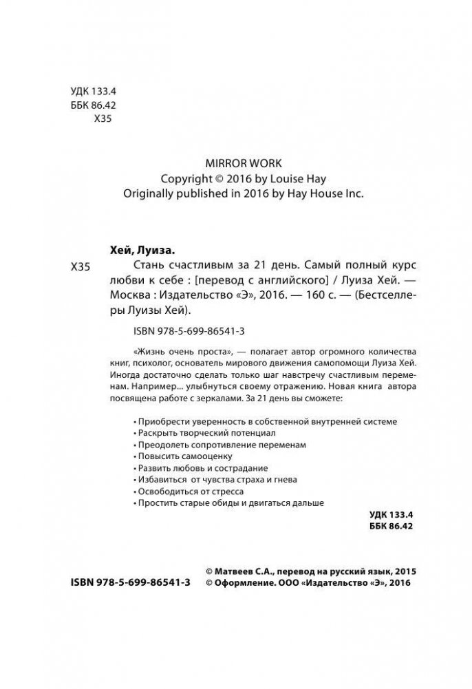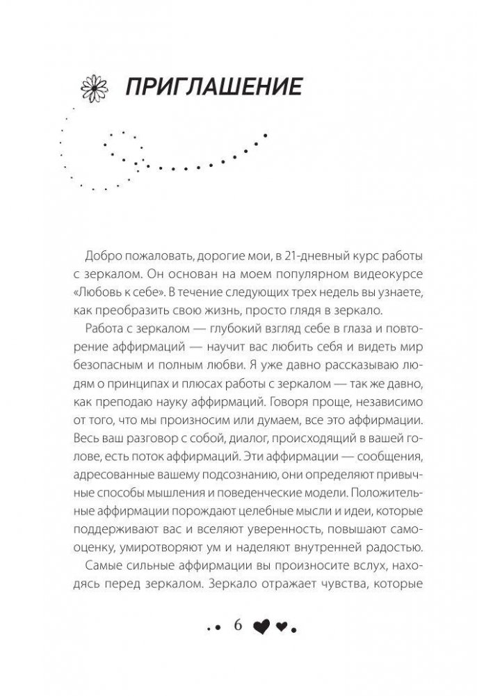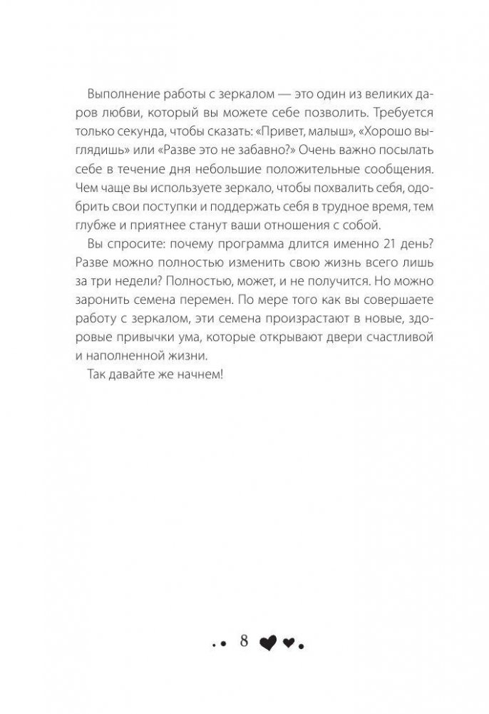 "Жизнь очень проста" – полагает автор огромного количества книг, психолог, основатель мирового движения самопомощи Луиза Хей. Иногда достаточно сделать только шаг навстречу счастливым переменам. Например улыбнуться, своему отражению. Новая книга автора посвящена работе с зеркалами. За 21 день вы сможете: - приобрести уверенность в собственной внутренней системе, - раскрыть творческий потенциал, - преодолеть сопротивление переменам, - повысить самооценку, - развить любовь и сострадание, - избавиться от чувства страха и гнева, - освободиться от стресса, - простить старые обиды и двигаться дальше.