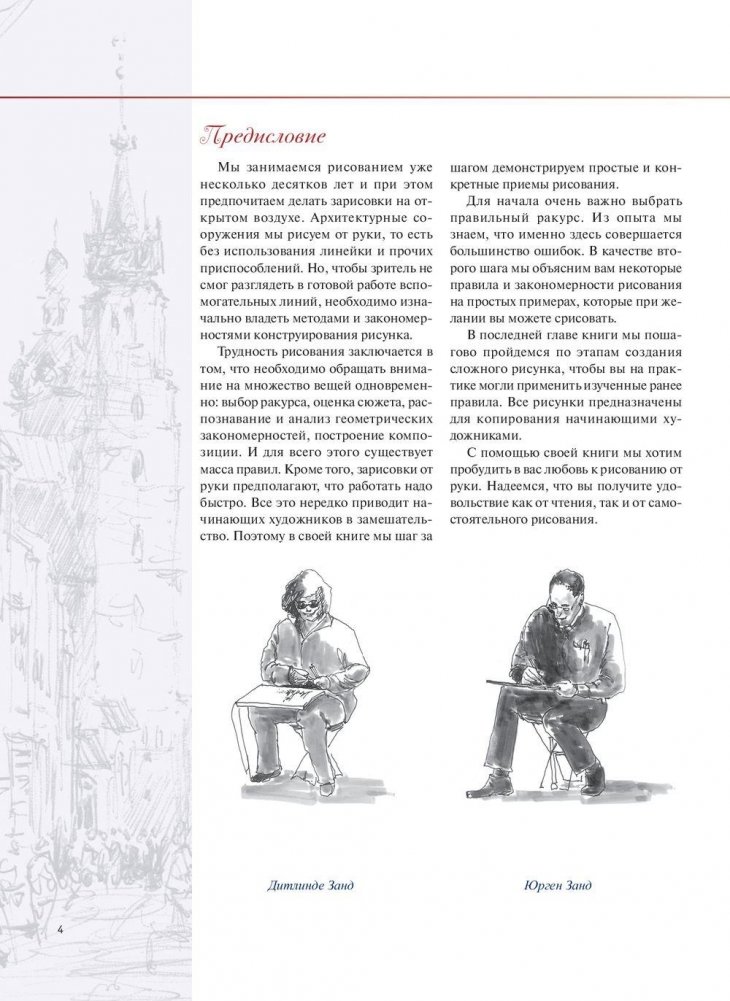 Умение делать зарисовки с натуры без разметки и вспомогательных линий представляется многим начинающим художникам недостижимым уровнем мастерства. Книга архитекторов Дитлинде и Юргена Занд наглядно демонстрирует, что это совсем нетрудно. Авторы делятся с нами основными принципами построения рисунка и на конкретных примерах шаг за шагом показывают, как эскизы делаются на практике. Многочисленные упражнения помогают вам усвоить теоретические знания, побуждают попробовать рисовать самому, позволяют набить руку и показывают: вам это тоже по силам!