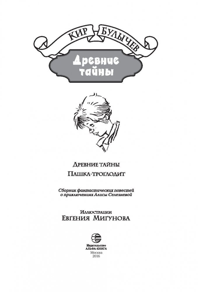 В сборник Кира Булычева вошли две повести о приключениях Алисы Селезневой и ее друзей — «Древние тайны» и «Пашка-троглодит». В первой повести рассказывается о том, как класс, в котором учится Алиса, начинает историческую практику и каждый ученик выбирает для себя тайну прошлого и пытается ее разгадать. Аркаша Сапожков отправляется в мезозойскую эру, чтобы выяснить, отчего вымерли динозавры. В далеком прошлом он становится свидетелем космического сражения и гибели звездолета. Тайна исчезновения динозавров оказывается связанной с этим событием. Во второй повести лучший друг Алисы Пашка Гераскин выбирает для своих исторических исследований каменный век и под видом сироты селится в пещере троглодитов. Он старается научить своих соплеменников новым для них знаниям, сам становится великим охотником, ввязывается в древнюю войну и подводит свое племя. Перед ним труднейшая задача — спастись самому и разгадать тайну исчезновения неандертальцев. В издании воспроизводятся 95 иллюстраций самого известного иллюстратора Кира Булычева — Евгения Мигунова.