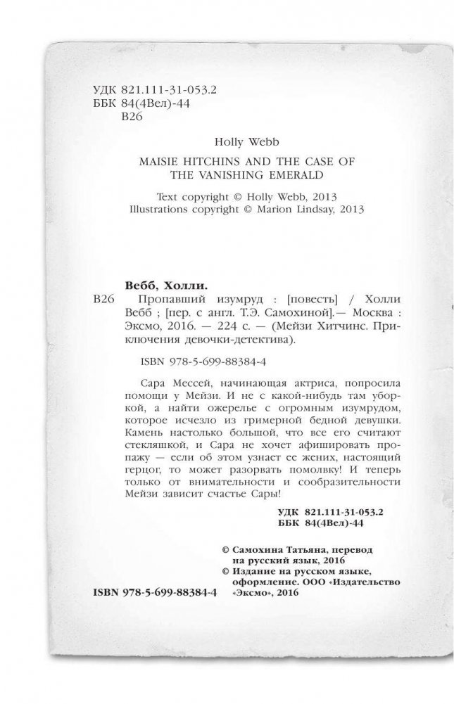 Сара Мессей, начинающая актриса, попросила помощи у Мейзи. И не с какой-нибудь там уборкой, а найти ожерелье с огромным изумрудом, которое исчезло из гримерной бедной девушки. Камень настолько большой, что все его считают стекляшкой, и Сара не хочет афишировать пропажу – если об этом узнает ее жених, настоящий герцог, то может разорвать помолвку! И теперь только от внимательности и сообразительности Мейзи зависит счастье Сары!