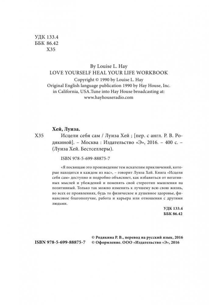 "Я посвещаю это произведение тем искателям приключений, которые находятся в каждом из нас", - говорит Луиза Хей. Книга «Исцели себя сам» доступно и подробно объясняет, как избавиться от негативных мыслей и убеждений и поменять свой стереотип мышления на позитивный. Только так можно изменить к лучшему всю свою жизнь, во всех ее проявлениях, будь то физическое и душевное здоровье, финансовое благополучие, работа и карьера или отношения с другими людьми.