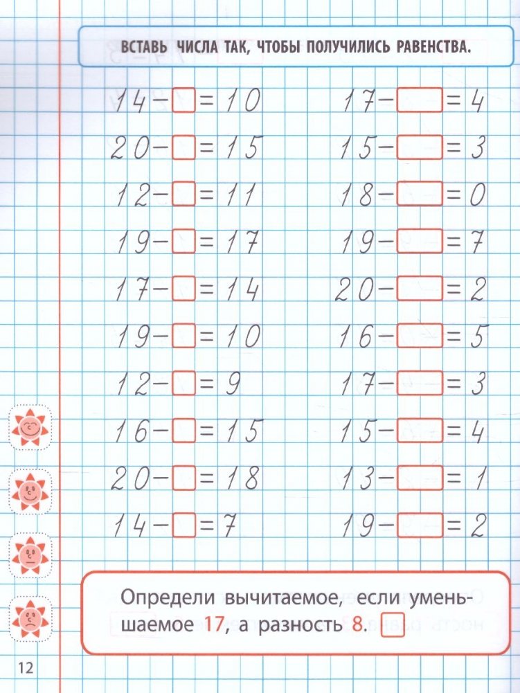 Это учебное пособие будет способствовать эффективному изучению математики в 1-м классе. В простой и доступной форме оно позволит развить, закрепить и проверить ключевые навыки ребёнка по самым важным темам изучаемого предмета. Специально подобранные примеры и задания помогут не только овладеть простейшими арифметическими действиями сложения и вычитания в пределах 20, но и научат правильно оформлять математические примеры и задачи. Все задания чётко сформированы и систематизированы в пределах одной страницы. Выполненную на каждой странице работу ребёнок может самостоятельно оценить — обвести на полях солнышко с соответствующей оценкой.