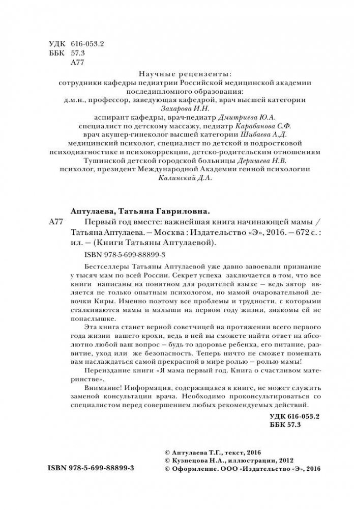 Бестселлеры Татьяны Аптулаевой уже давно завоевали признание у тысяч мам по всей России. Секрет успеха заключается в том, что все книги написаны на понятном для родителей языке - ведь автор является не только опытным психологом, но мамой очаровательной девочки Киры. Именно поэтому все проблемы и трудности, с которыми сталкиваются мамы и малыши на первом году жизни, знакомы ей не понаслышке. Эта книга станет верной советчицей на протяжении всего первого года жизни вашего крохи, ведь с ней вы сможете найти ответ на абсолютно любой ваш вопрос - будь то здоровье ребенка, его питание, развитие, уход или же безопасность. Теперь ничто не сможет помешать вам наслаждаться самой прекрасной в мире ролью – ролью мамы!
